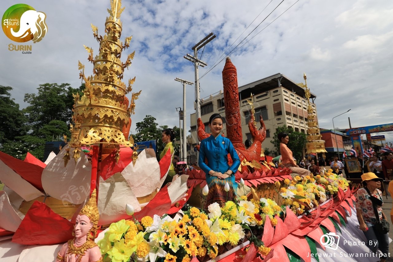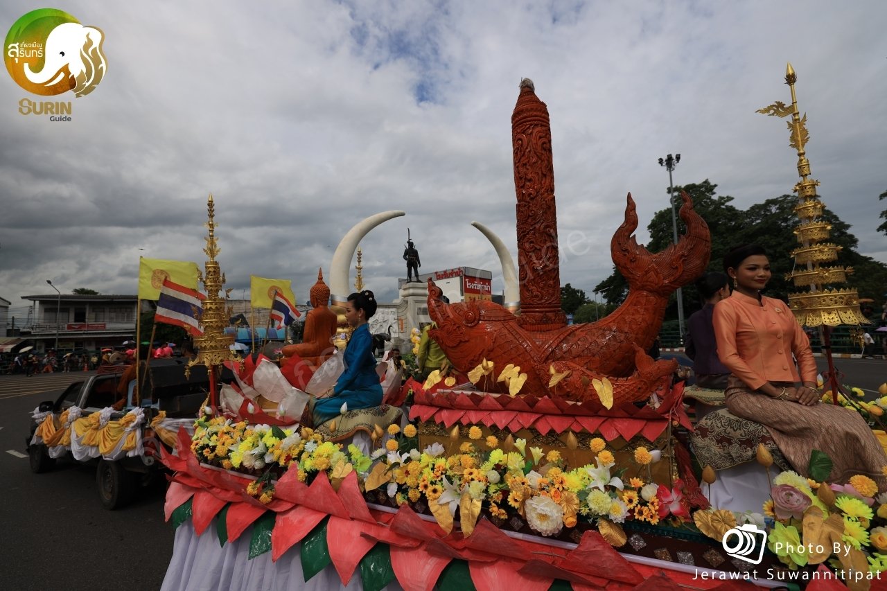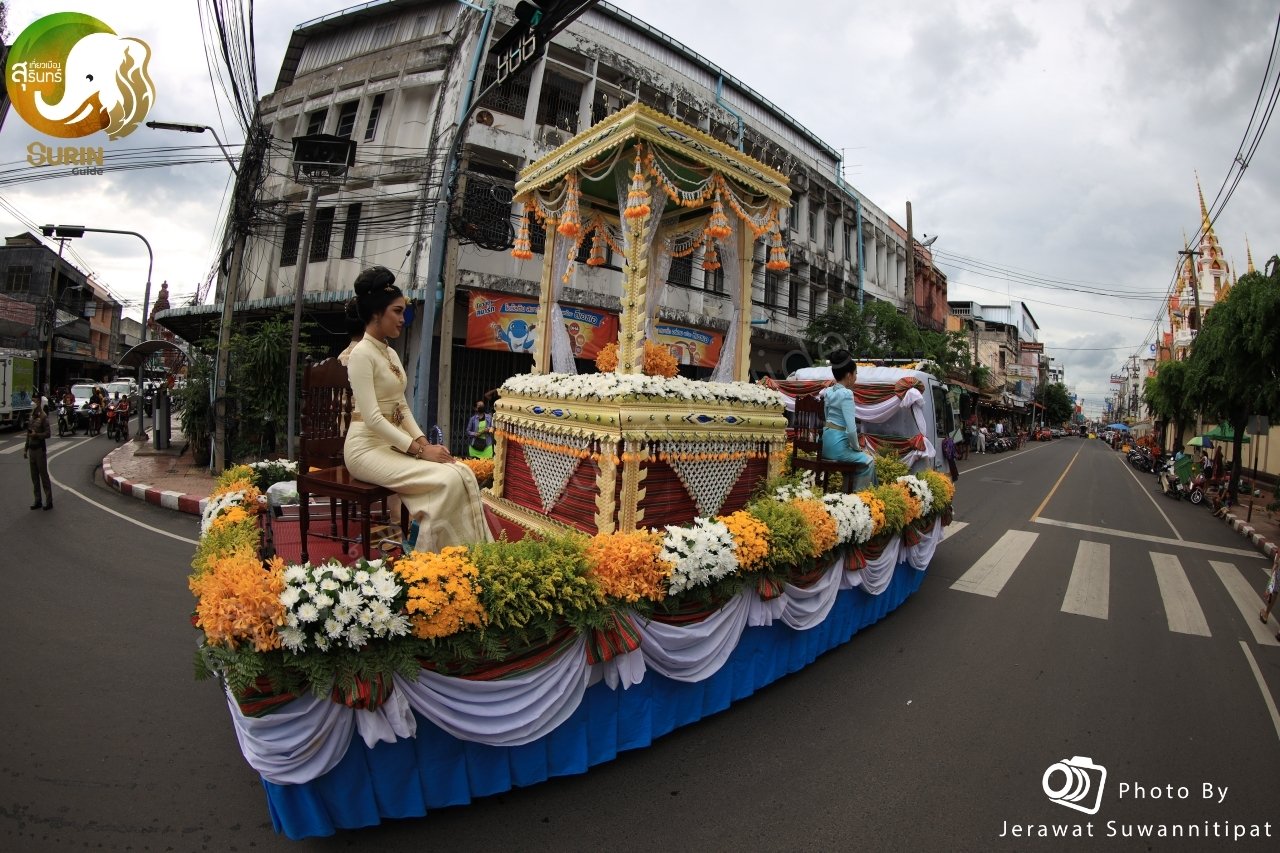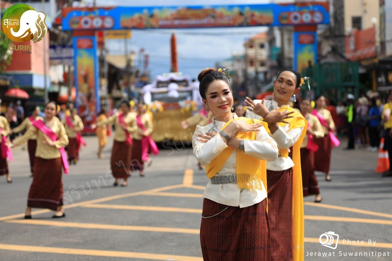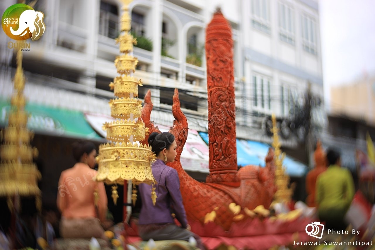 เทียนพรรษาถูกแกะสลักอย่างประณีตและจัดขบวนพร้อมการแสดงฟ้อนรำจากชาวบ้านในชุดประจำเผ่าท้องถิ่น เช่น เขมร กูย และลาว