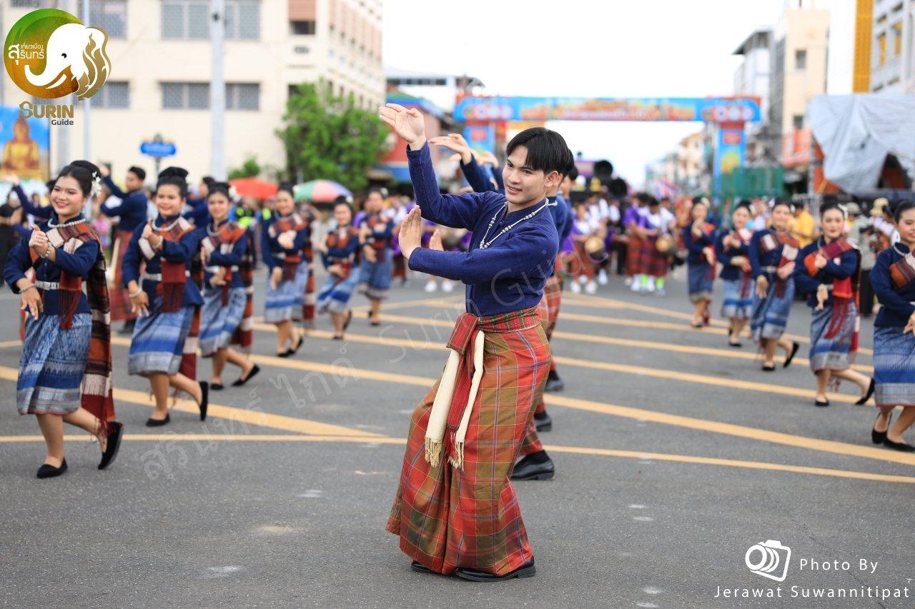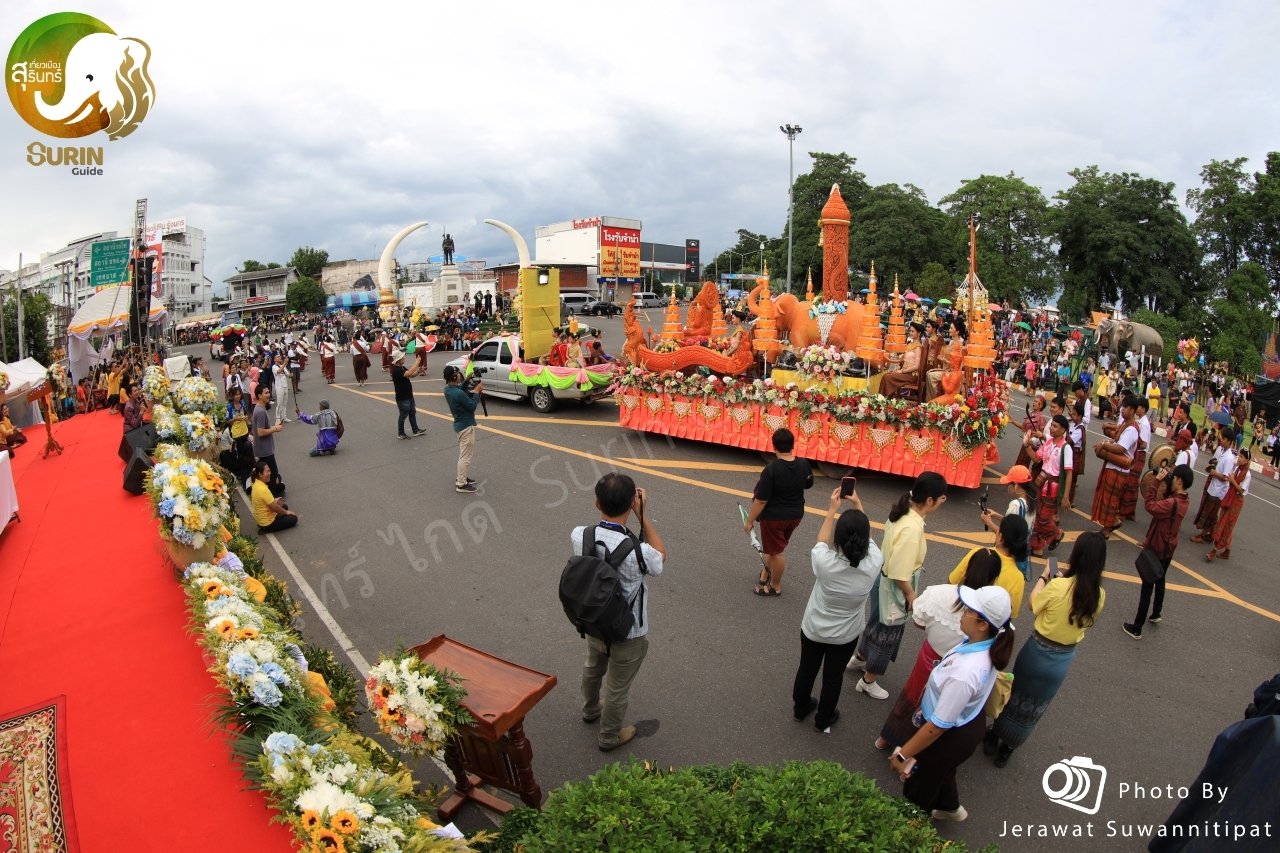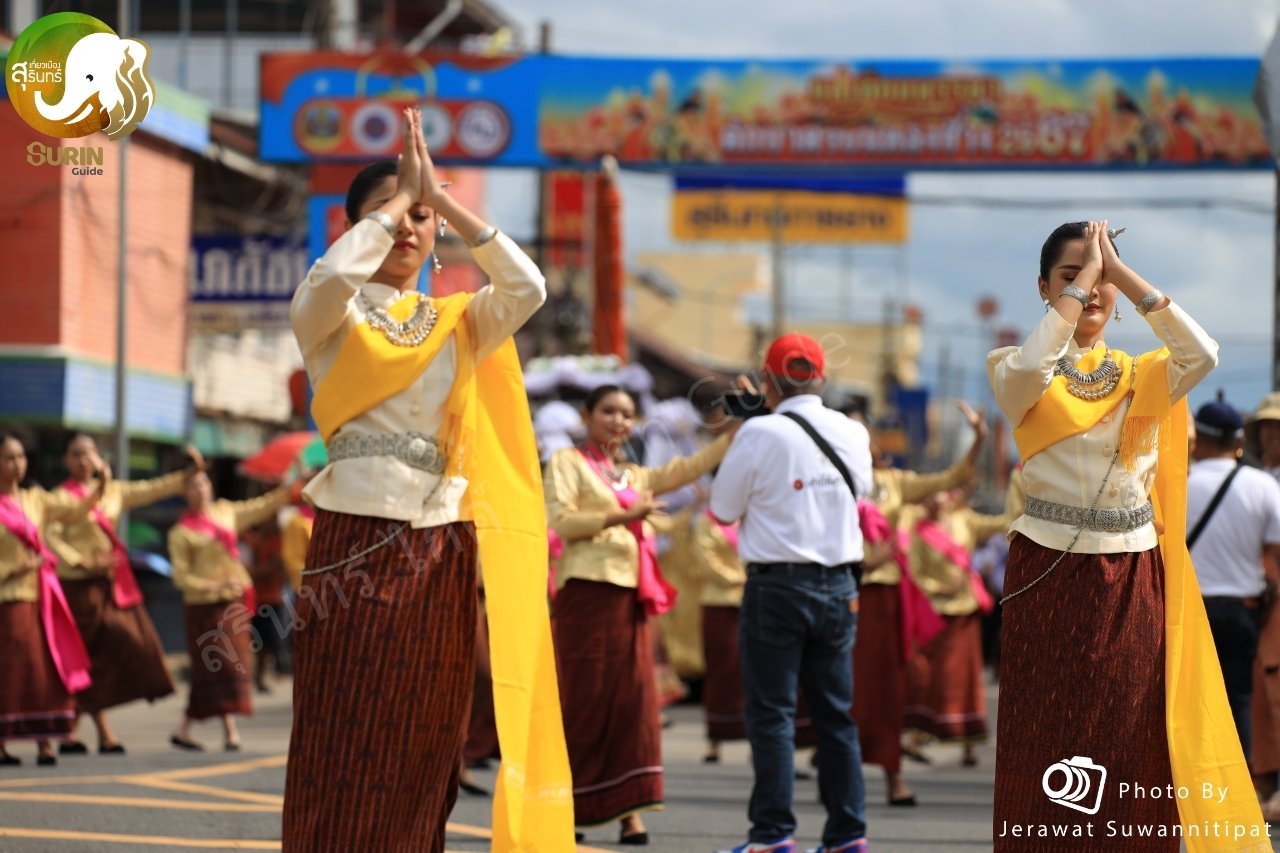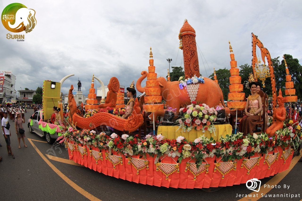 เทียนพรรษาถูกแกะสลักอย่างประณีตและจัดขบวนพร้อมการแสดงฟ้อนรำจากชาวบ้านในชุดประจำเผ่าท้องถิ่น เช่น เขมร กูย และลาว