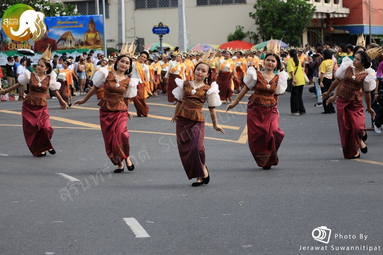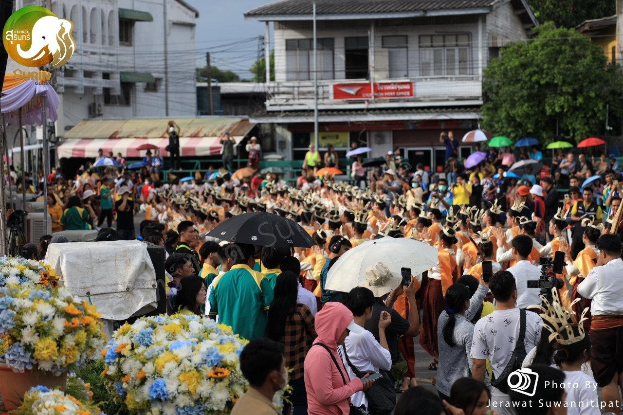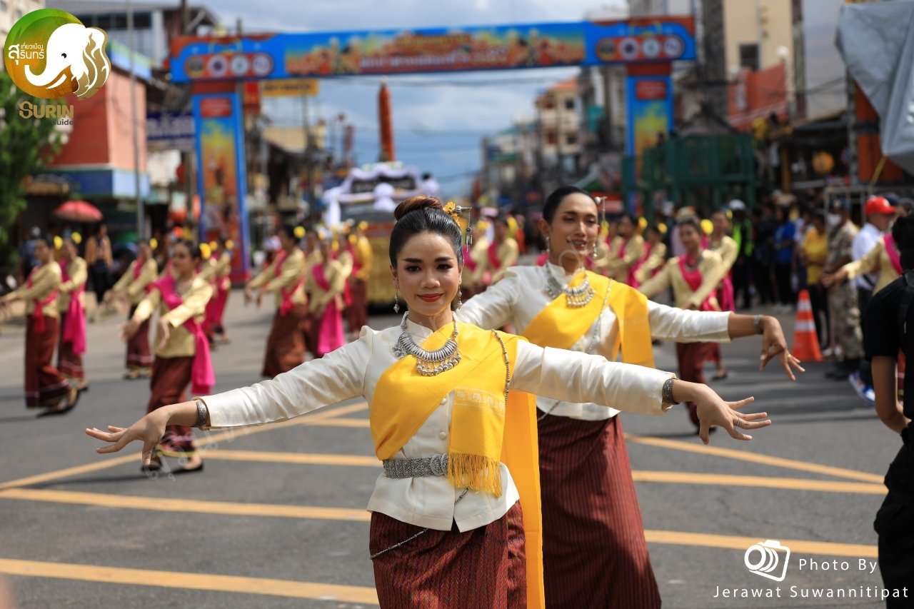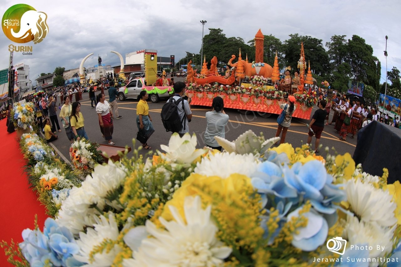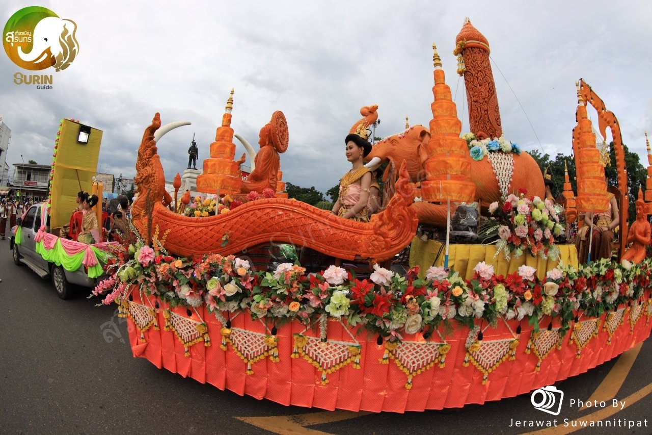 เทียนพรรษาถูกแกะสลักอย่างประณีตและจัดขบวนพร้อมการแสดงฟ้อนรำจากชาวบ้านในชุดประจำเผ่าท้องถิ่น เช่น เขมร กูย และลาว