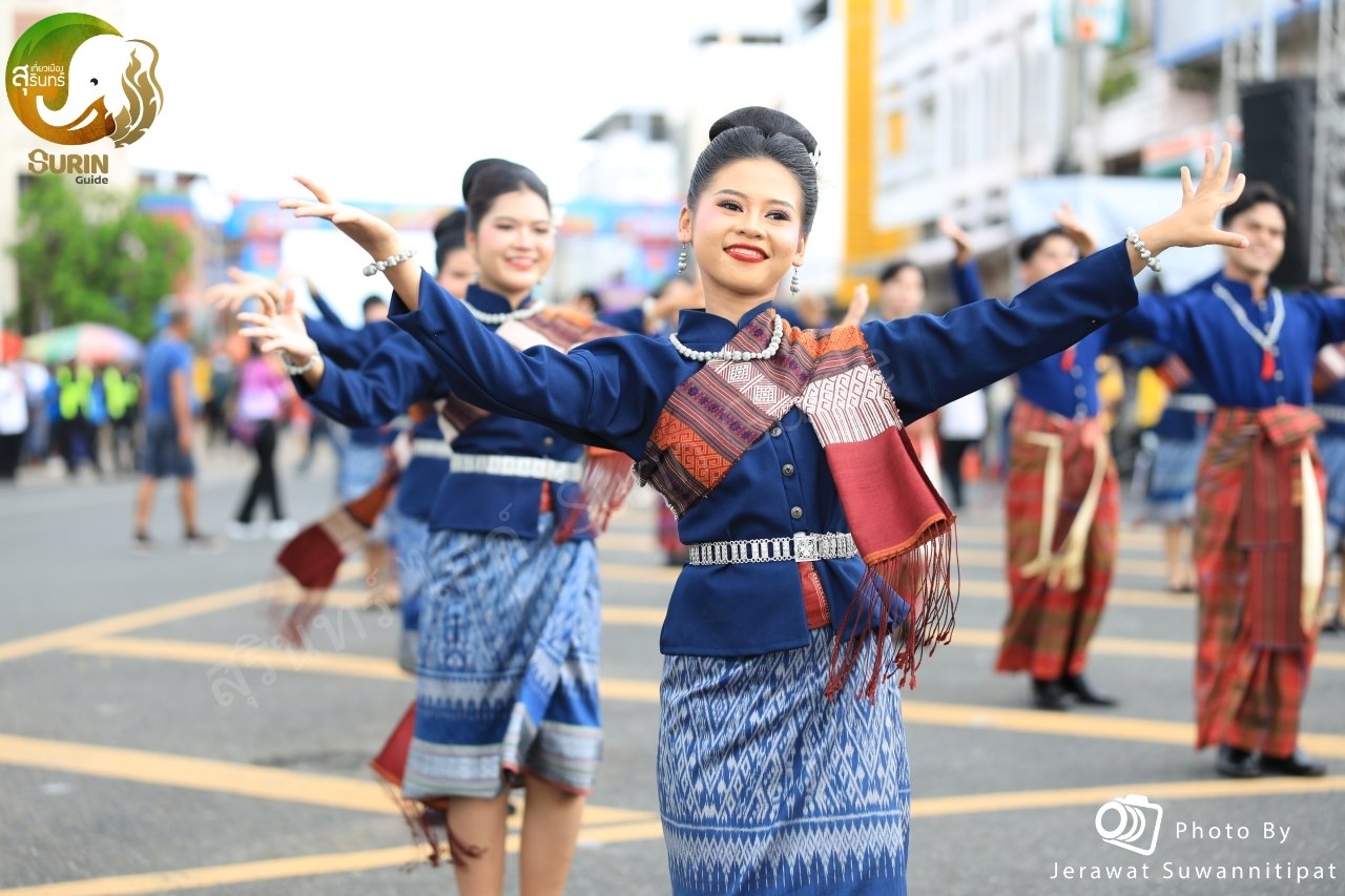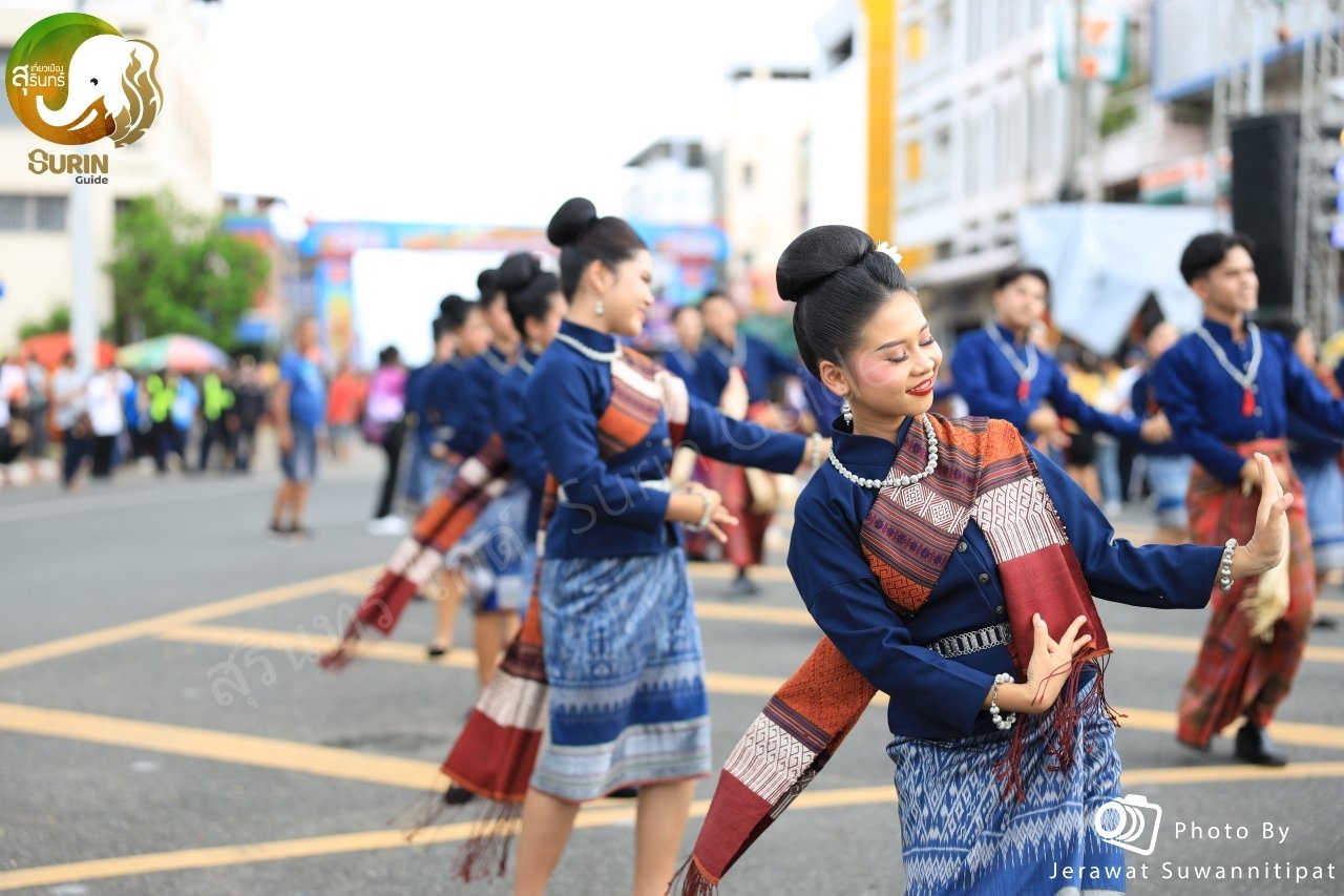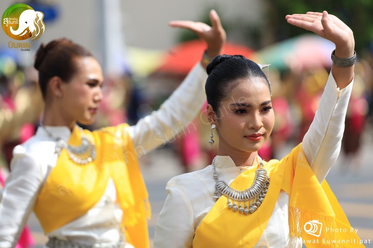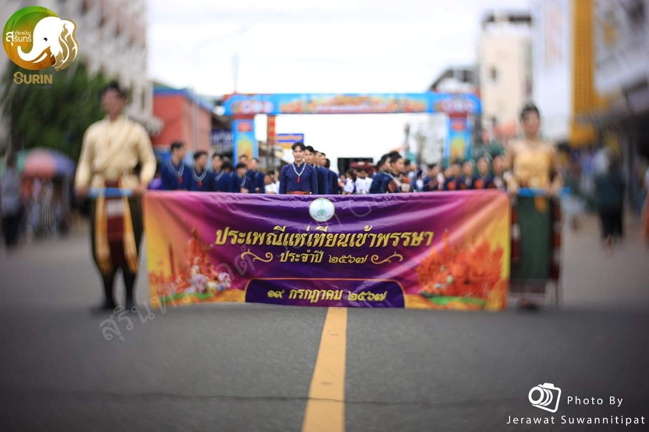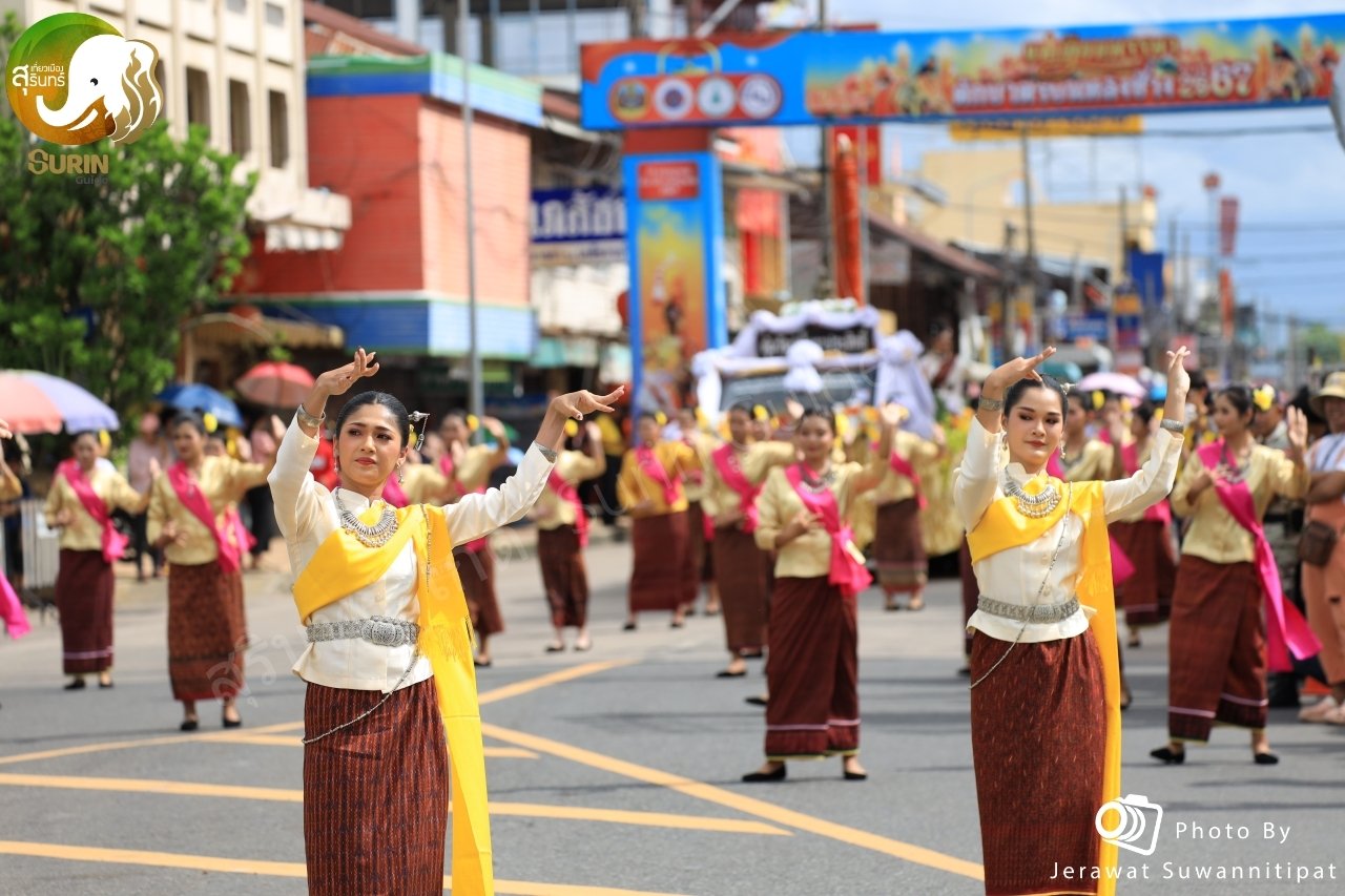 เทียนพรรษาถูกแกะสลักอย่างประณีตและจัดขบวนพร้อมการแสดงฟ้อนรำจากชาวบ้านในชุดประจำเผ่าท้องถิ่น เช่น เขมร กูย และลาว