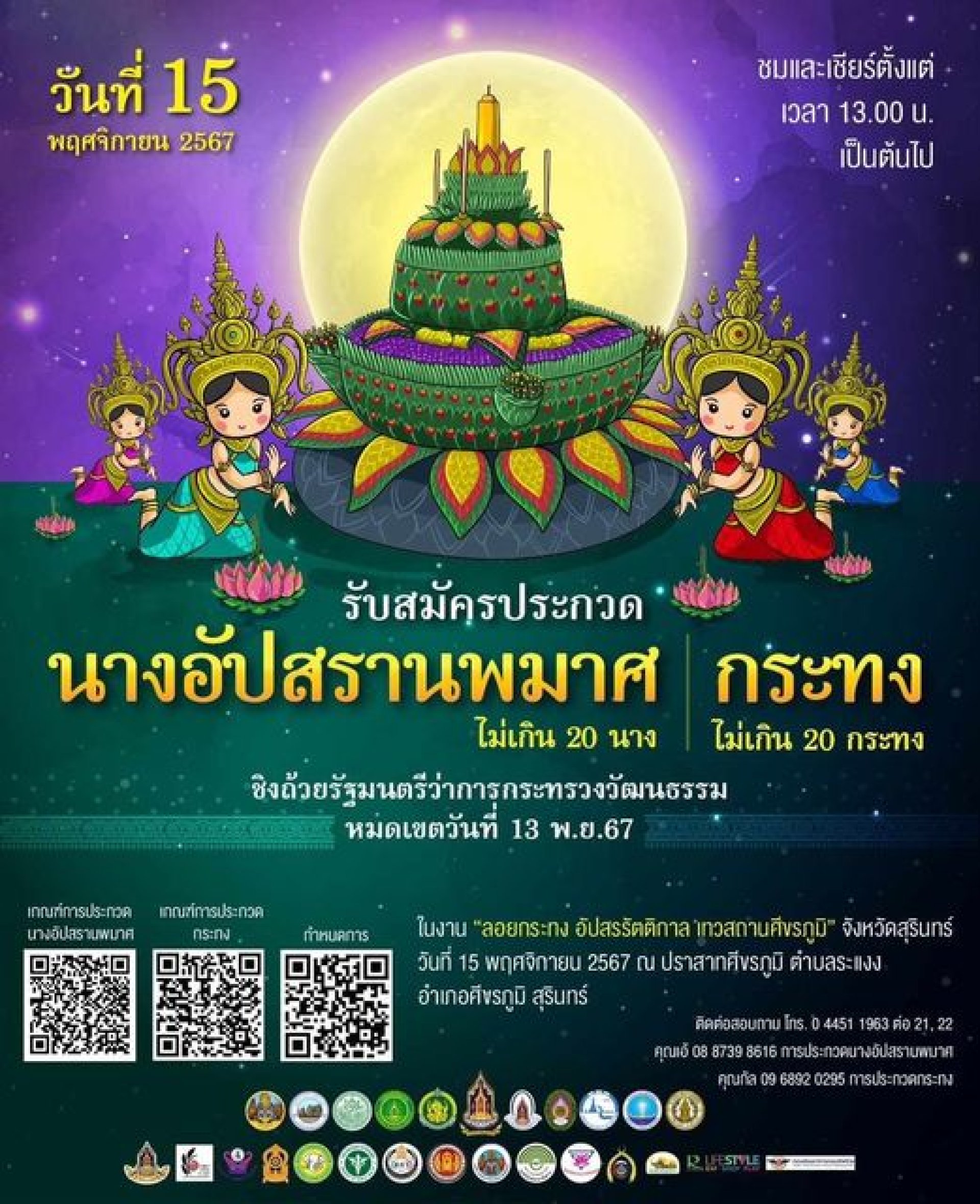 เปิดรับสมัครประกวดนางอัปสรานพมาศ ที่นี่ที่เดียวในประเทศไทย และประกวดกระทง ชิงถ้วยรัฐมนตรีว่าการกระทรวงวัฒนธรรม รับจำนวนจำกัด หมดเขตรับสมัคร 13 พฤศจิกายน 2567 นี้