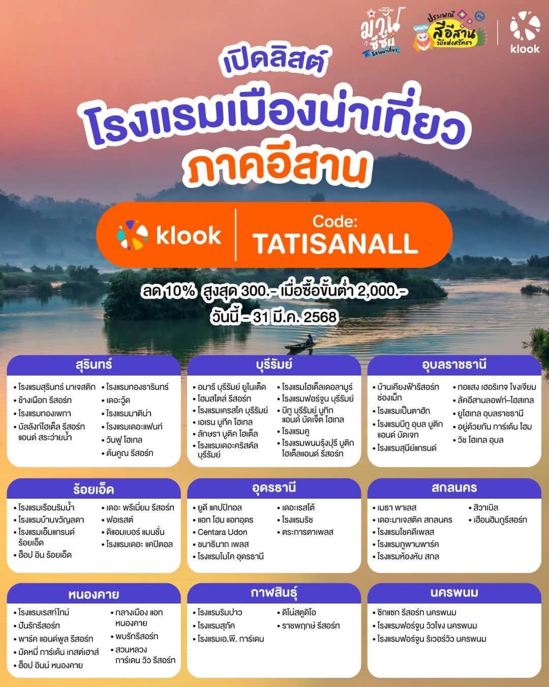 มัดรวมมาให้แล้ว! รายชื่อโรงแรมเมืองน่าเที่ยว ภาคอีสาน ในจังหวัดสุรินทร์ บุรีรัมย์ อุบลราชธานี ร้อยเอ็ด อุดรธานี สกลนคร หนองคาย กาฬสินธุ์ และ นครพนม ที่เข้าร่วมโปรพิเศษจาก klook