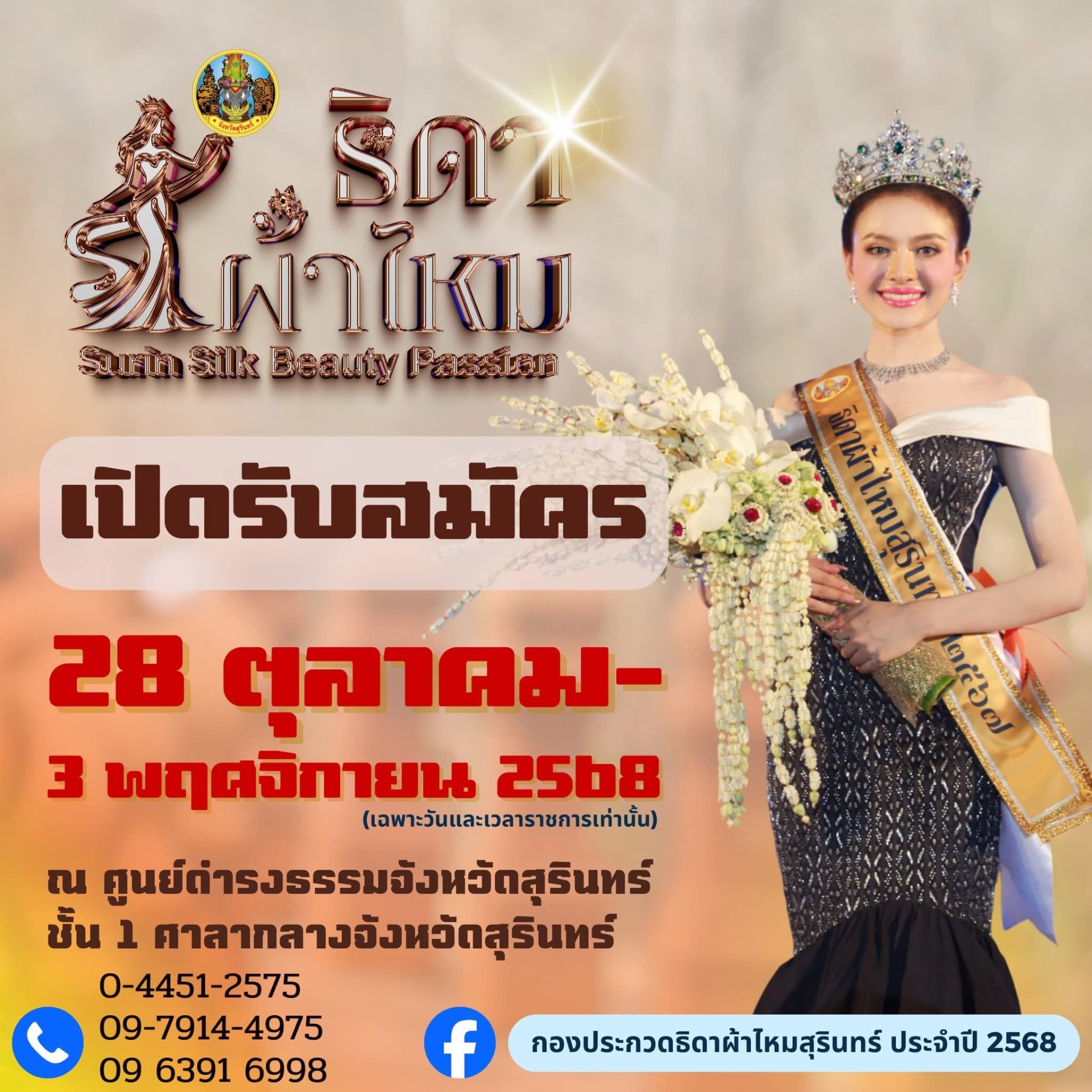 จังหวัดสุรินทร์ ขอเชิญสาวงามสุรินทร์ ที่มีอายุระหว่าง 17-28 ปี เข้าประกวดธิดาผ้าไหมสุรินทร์ ประจำปี 2568 ในงาน มหัศจรรย์งานช้างสุรินทร์ ประจำปี 2568