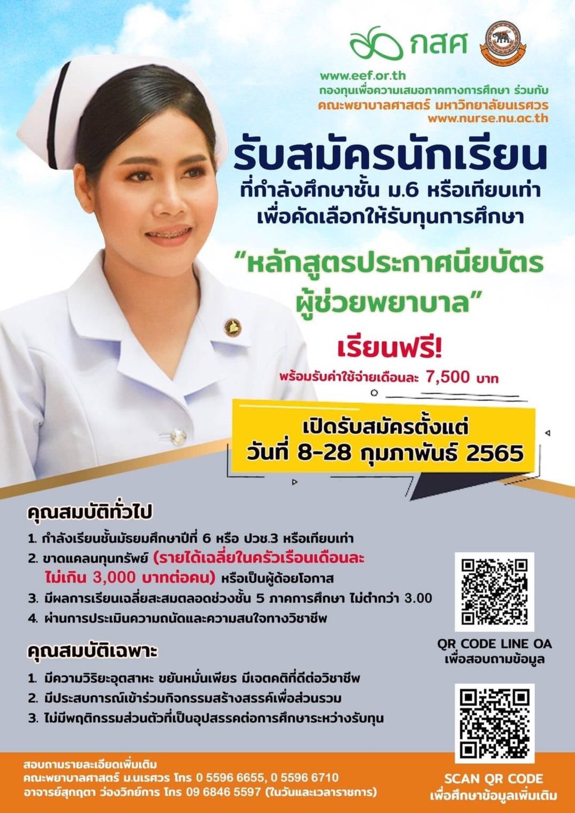 แจ้งข่าวประชาสัมพันธ์ครับ สำหรับเด็กที่เรียนดี ขาดทุน กำลังจะจบ ม.6 เชิญมาเรียน ผู้ช่วยพยาบาลครับ เรียนฟรี มีที่พัก และ มีค่าใช้จ่ายให้ เดือนละ 7,500 (ไม่ต้องใช้คืน) เรียนที่ มน. ครับ ถ้าเด็กคนใดสนใจ ติดต่อมาเลยครับ ที่เบอร์ คณะพยาบาลศาสตร์ ม.นเรศวร 055-966655 , 055-966710 หรือ อ.สุกฤตา ว่องวิทย์การ 096-8465597 (ในวันและเวลาราชการ