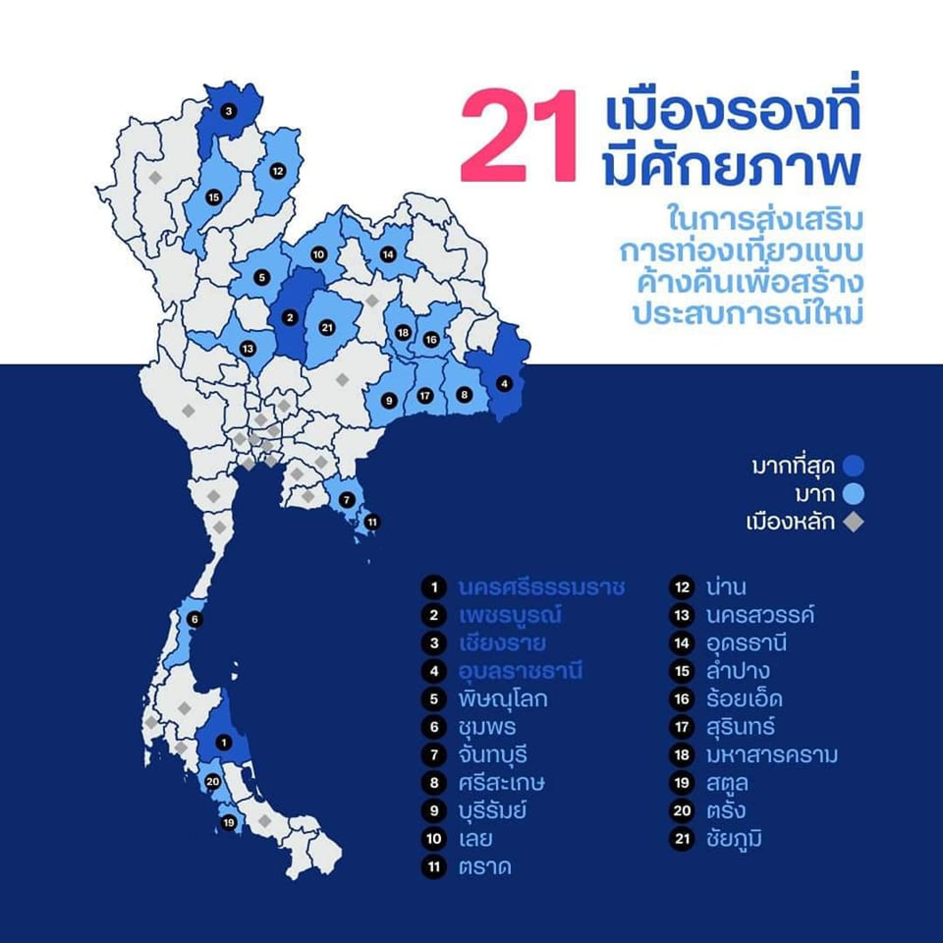 จังหวัดเมืองรองที่มีศักยภาพในการดึงดูดการท่องเที่ยวแบบค้างคืนในระดับสูงเมื่อเทียบกับจังหวัดเมืองรองด้วยกันเองประกอบด้วย 21 จังหวัด