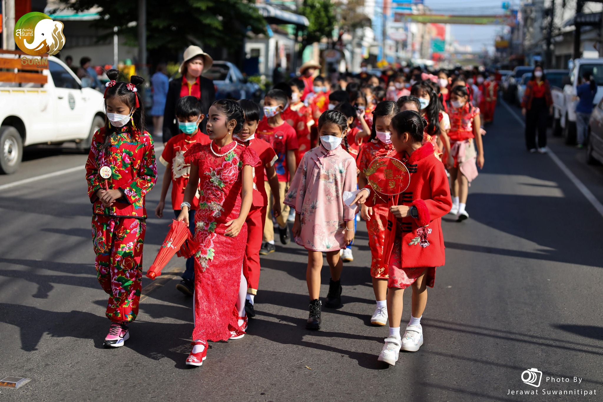การอัญเชิญสิ่งศักดิ์สิทธิ์ประจำจังหวัดสุรินทร์ขึ้นแห่บนรถ ซึ่งประกอบด้วย เทพยดาฟ้าดิน เจ้าพ่อหลักเมือง พระยาสุรินทรภักดีศรีณรงค์จางวาง โป๊ยเซียนโจวซือ ไต่ฮงกงโจวซือ ซึ่งเถ่ากงม่า แห่ไปตามเส้นทางในเมืองสุรินทร์ เพื่อให้ประชาชนชาวจังหวัดสุรินทร์ได้เคารพสักการะอย่างทั่วถึง อีกทั้งได้จัดให้มี การแข่งขันการแสดงมังกร และการแสดงเชิดสิงโต การแสดงศิลปวัฒนธรรมพื้นบ้าน ตลอดจนการออกร้านจําหน่ายสินค้า OTOP ร่วมในงานอีกด้วย