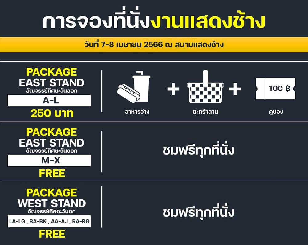 วันที่ 7-8 เมษายน งานแสดงช้างแสง สี เสียง เปิดให้นักท่องเที่ยวเข้าชมได้ฟรี สำหรับนักท่องเที่ยวหรือผู้ชมที่ประสงค์จะรับบริการ สามารถสำรองที่นั่งล่วงหน้าในราคาท่านละ 250 บาท โดยท่านจะได้รับบริการดังนี้