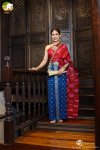 ผ้านุ่ง เป็นผ้ายกไหมจกลายทอง ลายดาวล้อมเดือน เส้นยืนและพุ่งเป็นสีคราม