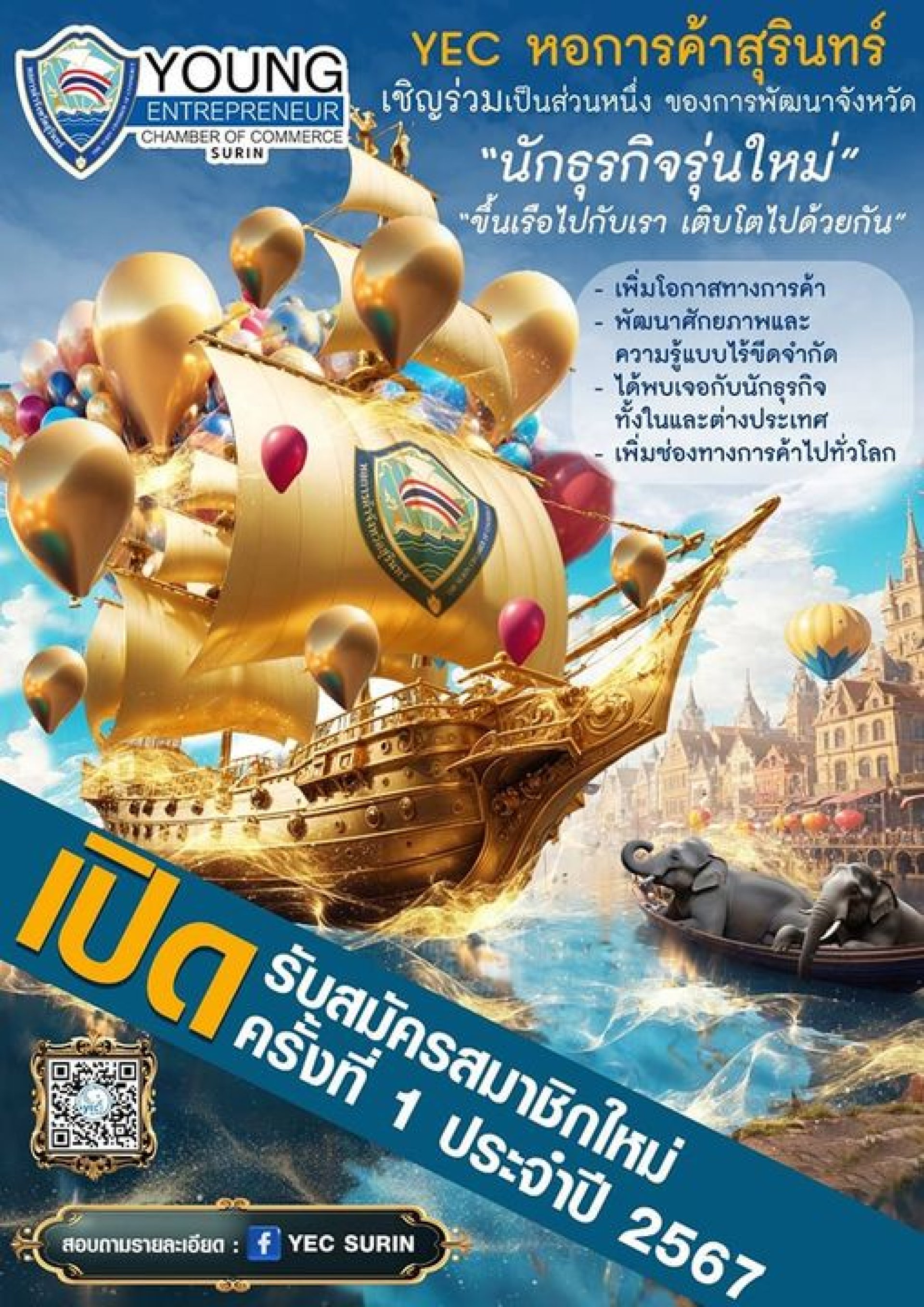 พี่ๆน้องๆท่านใดสนใจ ร่วมลงเรือกับเรา มาเป็นส่วนหนึ่งใน YEC SURIN กลุ่มนักธุรกิจรุ่นใหม่ ไฟแรง พร้อมรู้จักพี่น้องใหม่ๆ เป็นครอบครัวเดียวกับเรา เพื่อสร้างมิตรภาพ สร้างโอกาสทางธุรกิจ ร่วมเดินเรือพัฒนาจังหวัดสุรินทร์กันกับเรา เรือลำนี้พร้อมออกเดินทางไปสู่ตลาดไทย และ ตลาดโลกแล้ววันนี้ สมัครเลยตาม QR code ใต้ภาพ