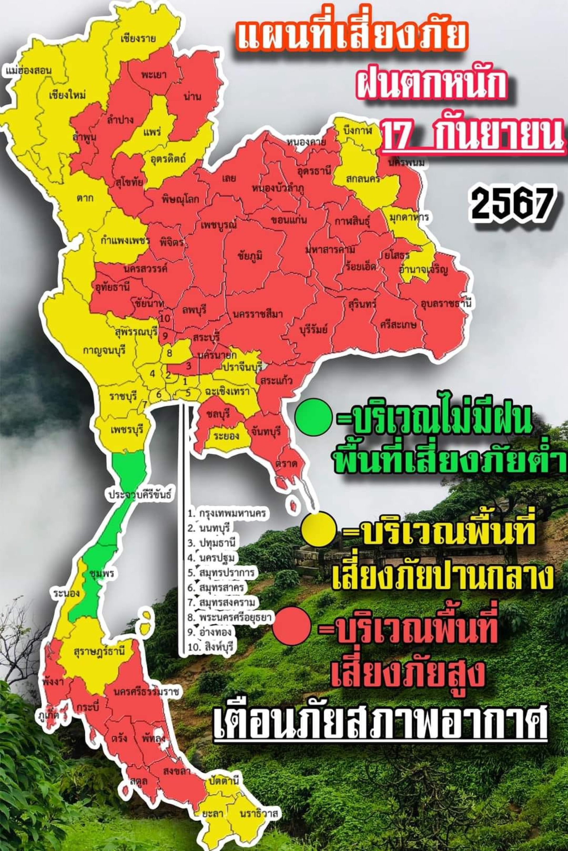 แผนที่เสี่ยงภัยพื้นที่ที่จะมีฝนตกหนัก- หนักมาก วันที่ 17 กันยายน 2567