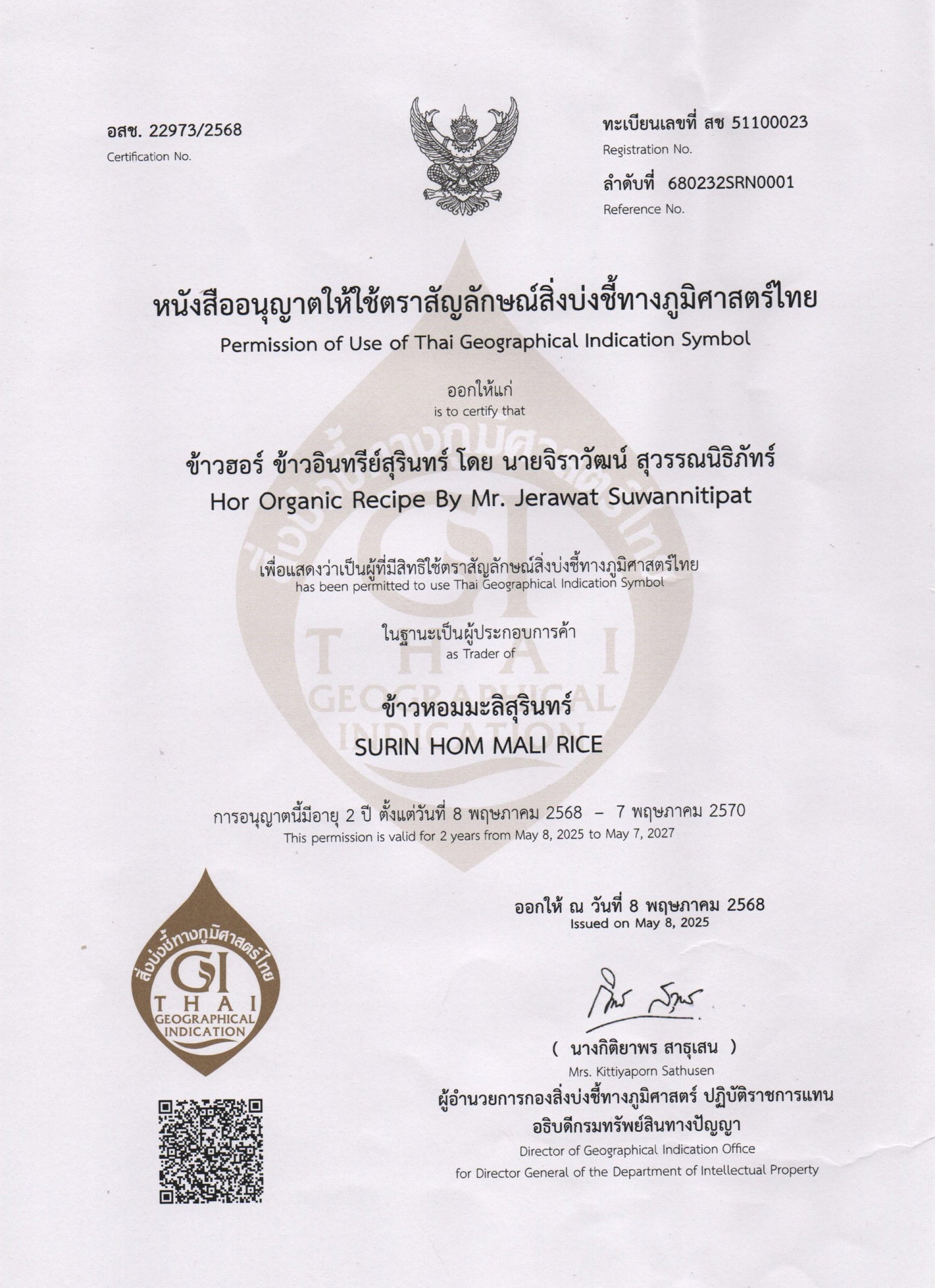 ข้าวฮอร์ ข้าวอินทรีย์สุรินทร์ ได้รับรอง #เครื่องหมาย #GI #ตราสัญลักษณ์บ่งชี้ทางภูมิศาสตร์ไทย ของ #ข้าวหอมมะลิสุรินทร์ (#SurinHomMaliRice)