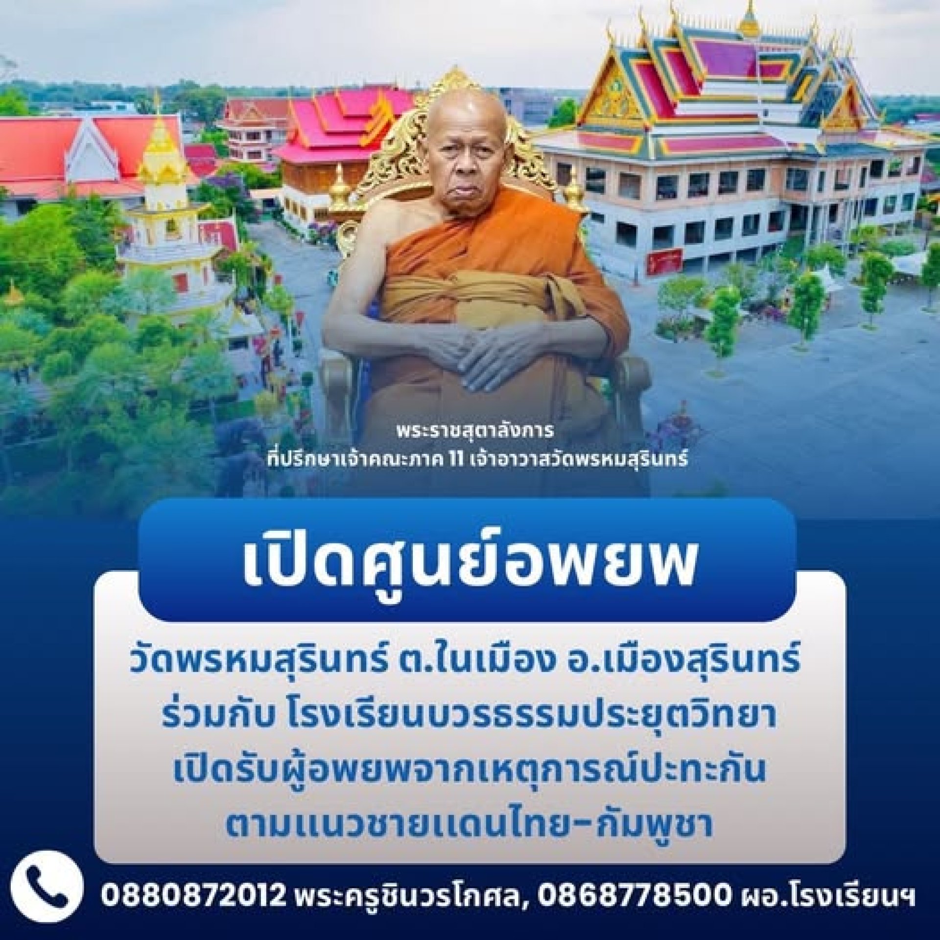 วัดพรหมสุรินทร์ ยินดีต้อนรับผู้ที่ได้รับผลกระทบจากเหตุการณ์ชายแดนสุรินทร์ทุกท่านครับ