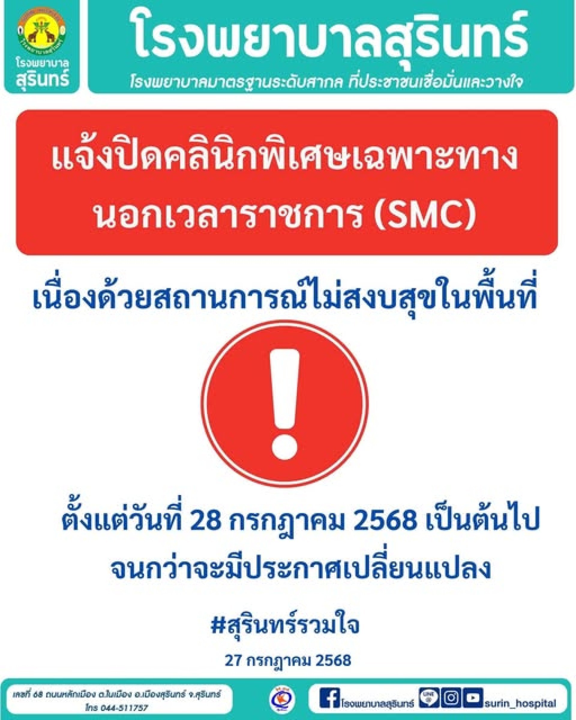 โรงพยาบาลสุรินทร์แจ้งปิดคลินิกพิเศษเฉพาะทางนอกเวลาราชการ (SMC)