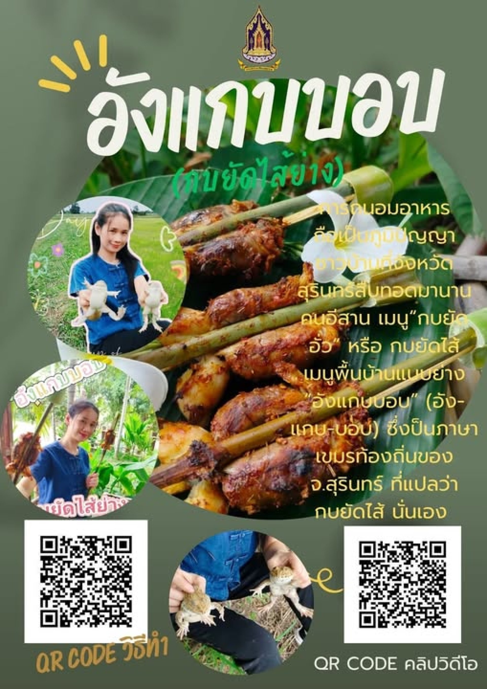 อังแกบบอบ การถนอมอาหารแบบภูมิปัญญาชาวบ้านจังหวัดสุรินทร์สืบทอดมานาน เมนู กบยัดไส้ หรือ อังแกบบอบ (ภาษาท้องถิ่นสุรินทร์)