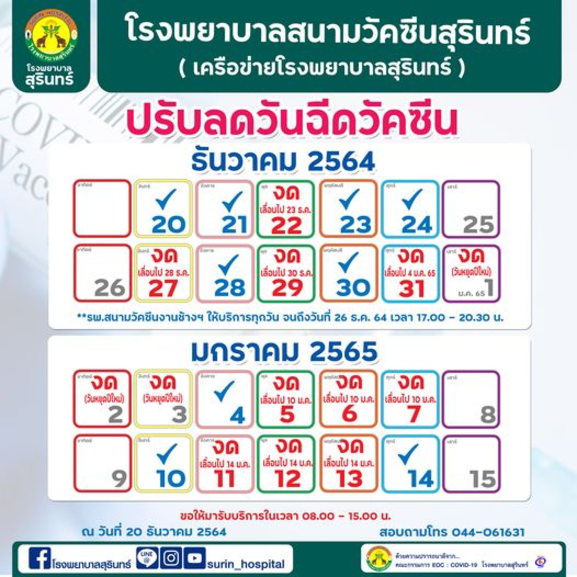 การีบเช็คด่วน เนื่องด้วยปัจจุบันประชาชนในเขตเมืองสุรินทร์ได้รับวัคซีนโควิดครอบคลุมมากขึ้น และการละบาดของโดวิด -19 ก็เริ่มเบาบางลง ทางรพ.สนามวัคซีนสุรินทร์ จึงขอปรับลดวันให้บริการ เป็นเปิดบริการตามวันดังต่อไปนี้....โดย