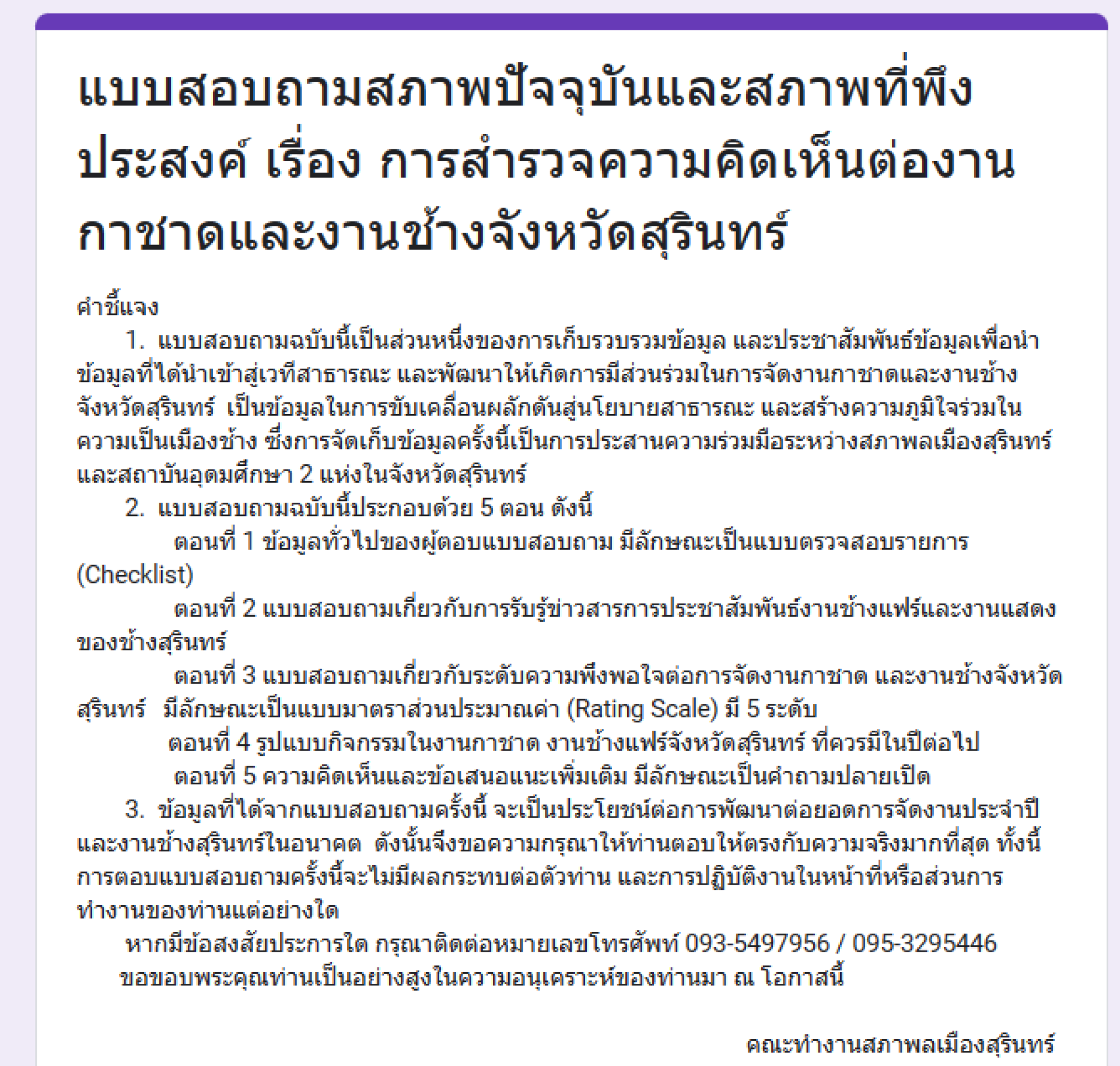 รบกวนทุกท่านมีส่วนร่วมในการตอบแบบสอบถามและข้อเสนอแนะเกี่ยวกับงานช้างที่ท่านอยากจะเห็นและอยากให้เป็นแบบไกนเพื่อการเปลี่ยนแปลงที่ดีขึ้น จะเป็นประโยชน์ต่อการพัฒนาต่อยอดการจัดงานประจำปีและงานช้างสุรินทร์ในอนาคต ดังนั้นจึงขอความกรุณาให้ท่านตอบให้ตรงกับความจริงมากที่สุด ทั้งนี้การตอบแบบสอบถามครั้งนี้จะไม่มีผลกระทบต่อตัวท่าน และการปฏิบัติงานในหน้าที่หรือส่วนการทำงานของท่านแต่อย่างใด และจะนำข้อมูลนี้เป็นข้อมูลนำเข้าสู่เวทีสาธารณะในวันที่24ม.ค.65นี้ครับ