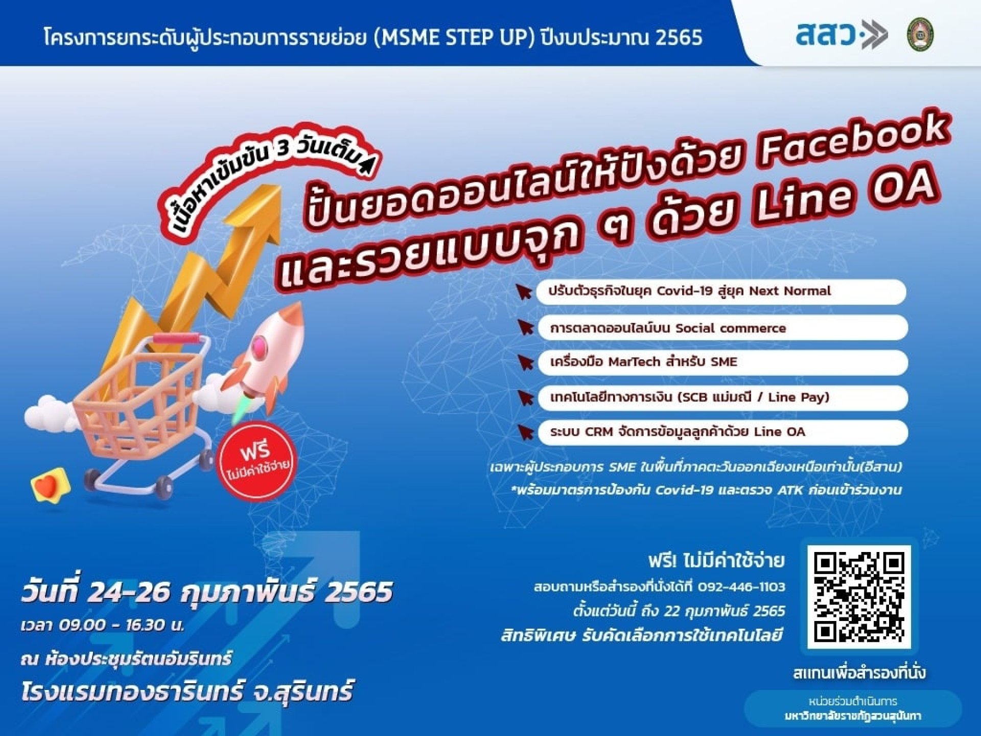 พื้นที่ภาคตะวันออกเฉียงเหนือ (อีสาน) เข้าร่วมอบรมหลักสูตร 3 วัน เนื้อหาหลักสูตร ปรับตัวธุรกิจในยุค Covid-19 สู่ยุค Next Normal เครื่องมือ MarTech สำหรับ SME เทคโนโลยีทางการเงิน (SCB แม่มณี / Line Pay)ระบบ CRM จัดการข้อมูลลูกค้าด้วย Line OA