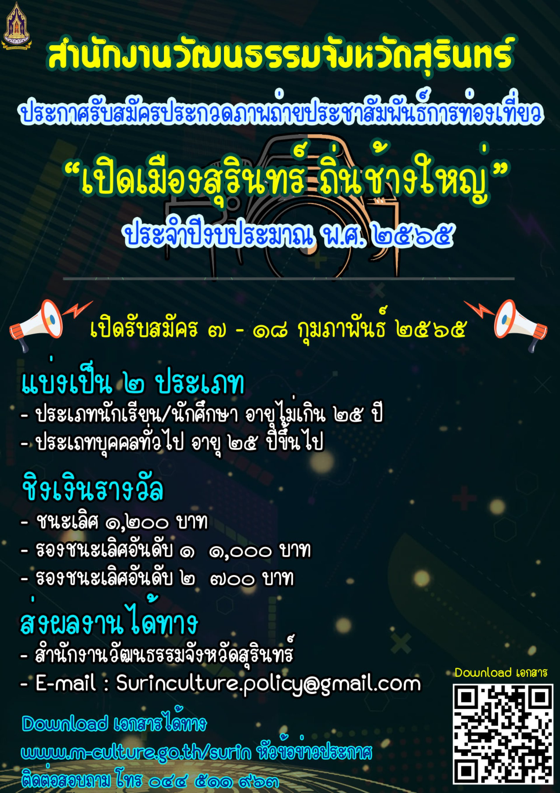 ประกาศรับสมัครประกวดภาพถ่ายประชาสัมพันธ์การท่องเที่ยว เปิดเมืองสุรินทร์ ถิ่นช้างใหญ่ ประจำปีงบประมาณ พ.ศ. ๒๕๖๕