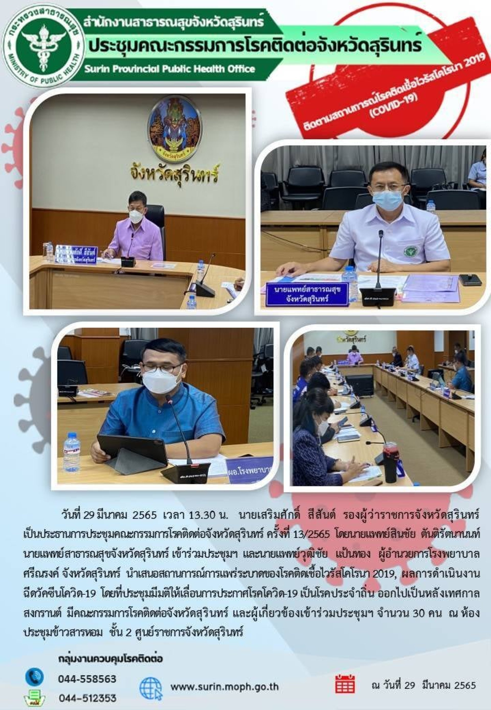 วันที่ 29 มีนาคม 2565 เวลา 13.30 นนายเสริมศักดิ์สีสันรองผู้ว่าราชการจังหวัดสุรินทร์เป็นประธานการประชุมคณะกรรมการโรคติดต่อจังหวัดสุรินทร์ครั้งที่ 13/2565 โดยนายแพทย์สินชัยตันติรัตนานนท์นายแพทย์สาธารณสุขจังหวัดสุรินทร์เข้าร่วมประชุมและนายแพทย์วุฒิชัยแป้นทองผู้อำนวยการโรงพยาบาลศรีณรงค์จังหวัดสุรินทร์นำเสนอสถานการณ์การแพร่ระบาดของโรคติดเชื้อไวรัสโคโรน่า 2019 ผลการดำเนินงานฉีดวัคซีนโควิด 19 โดยที่ประชุมมีมติให้เลื่อนการประกาศโรคโควิด 19 เป็นโรคประจำถิ่นออกเป็นหลังเทศกาลสงกรานต์มีคณะกรรมการโรคติดต่อจังหวัดสุรินทร์และผู้เกี่ยวข้องเข้าร่วมประชุมจำนวน 30 คนณห้องประชุมข้าวสารหอมชั้น 2 ศูนย์ราชการจังหวัดสุรินทร์