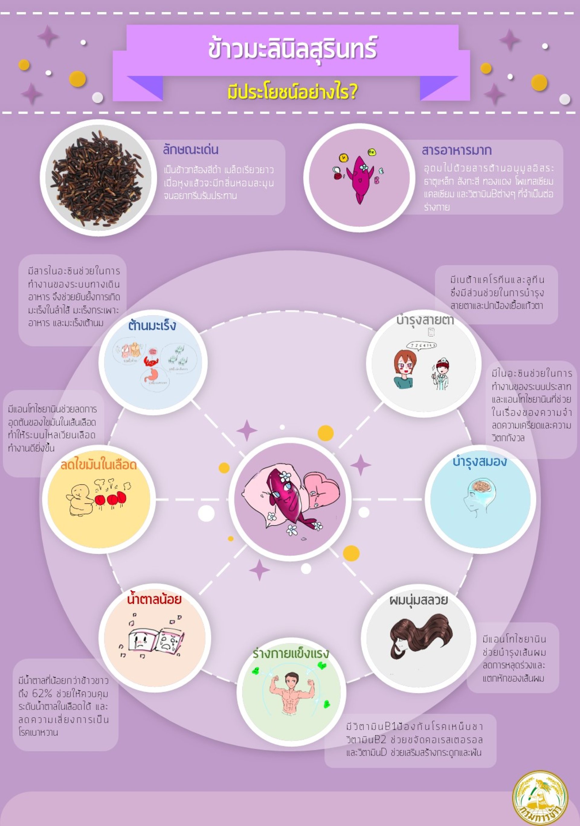 ข้าวมะลินิลสุรินทร์ อุดมด้วยสาร แอนโธไซยานิน และฟีโนลิก ซึ่งช่วยชะลอผิวหนังไม่ให้เหี่ยวแห้งเร็วก่อนวัยอันควร มีฤทธิ์ในการต้านอนุมูลอิสระสูง ต้านการซึมเศร้า การวิตกกังวล ช่วยยับยั้งการเกิดมะเร็งและออกฤทธิ์ช่วยในการขยายเส้นเลือด ช่วยลดความเสี่ยงในการเป็นโรคหัวใจ เส้นเลือดอุดตันในสมอง โรคอัลไซเมอร์ โรคอัมพาต และเบาหวาน เบต้าแคโรทีน บำรุงสายตา บำรุงผิวพรรณ วิตามิน B1 ช่วยป้องกันโรคเหน็บชา นอกจากนี้ มะลินิลสุรินทร์ ยังมี วิตามิน D, E, B2,B6 และไนอะซีน