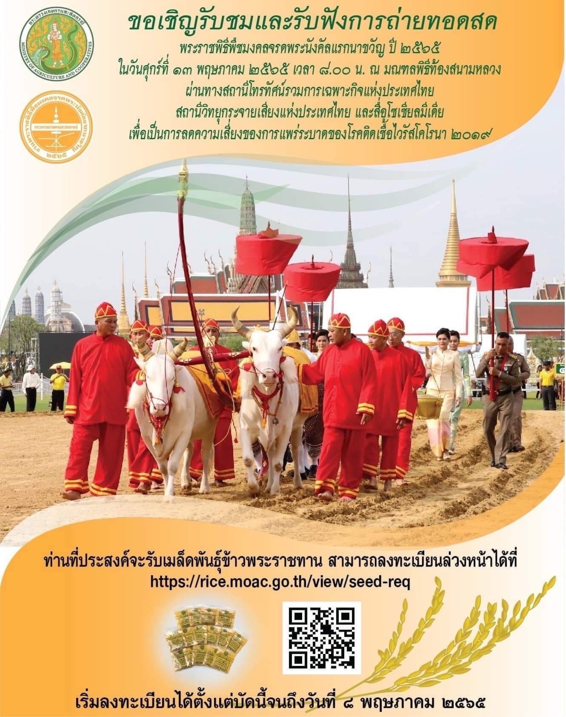 ขอเชิญร่วมรับชมและรับฟังการถ่ายทอดสดพระราชพิธีมงคลเฉลิมพระราชทานแรกนาขวัญปี 2565 ในวันศุกร์ที่ 13 พฤษภาคม 2565 เวลา 8 :00 นมงคลพิธีท้องสนามหลวงฐานทักษะสถานีโทรทัศน์เรื่องการเฉพาะกิจแห่งประเทศไทยจะจอยเสียงแห่งประเทศไทยสถานีวิทยุจะจ่ายเสียแห่งประเทศไทยและสื่อโซเชียลมีเดียเพื่อเป็นการลดความเสี่ยงของการแพร่ระบาดของโรคติดเชื้อไวรัสโคโรน่า 2019