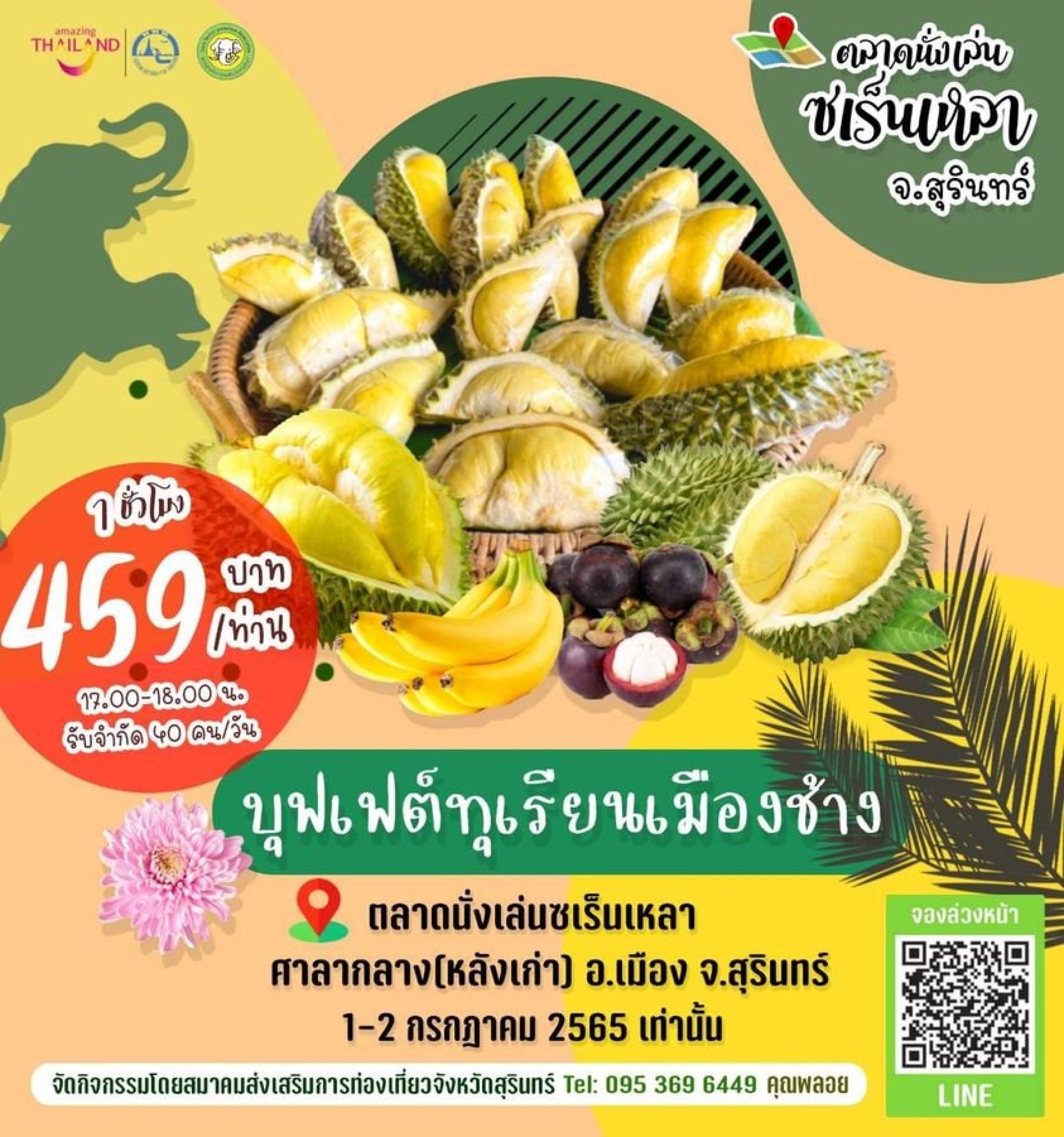 งานนี่บอกเลย ต้องร้องว้าวจนเก็บความหิวไว้ไม่อยู่ กับครั้งแรกของสุรินทร์ถิ่นช้างใหญ่ พบกับงาน บุฟเฟต์ทุเรียนเมืองช้าง งานที่รวมเอาทุเรียนเนื้อแน่นๆ เน้นๆ รวมทั้งผลไม้ต่างๆ มาให้ได้ทานกับแบบไม่อั้น! จุใจ ในราคาเหมาๆ สบายๆ เพียง 459 บาท/ท่าน และ 160 บาท/ท่าน !!!!