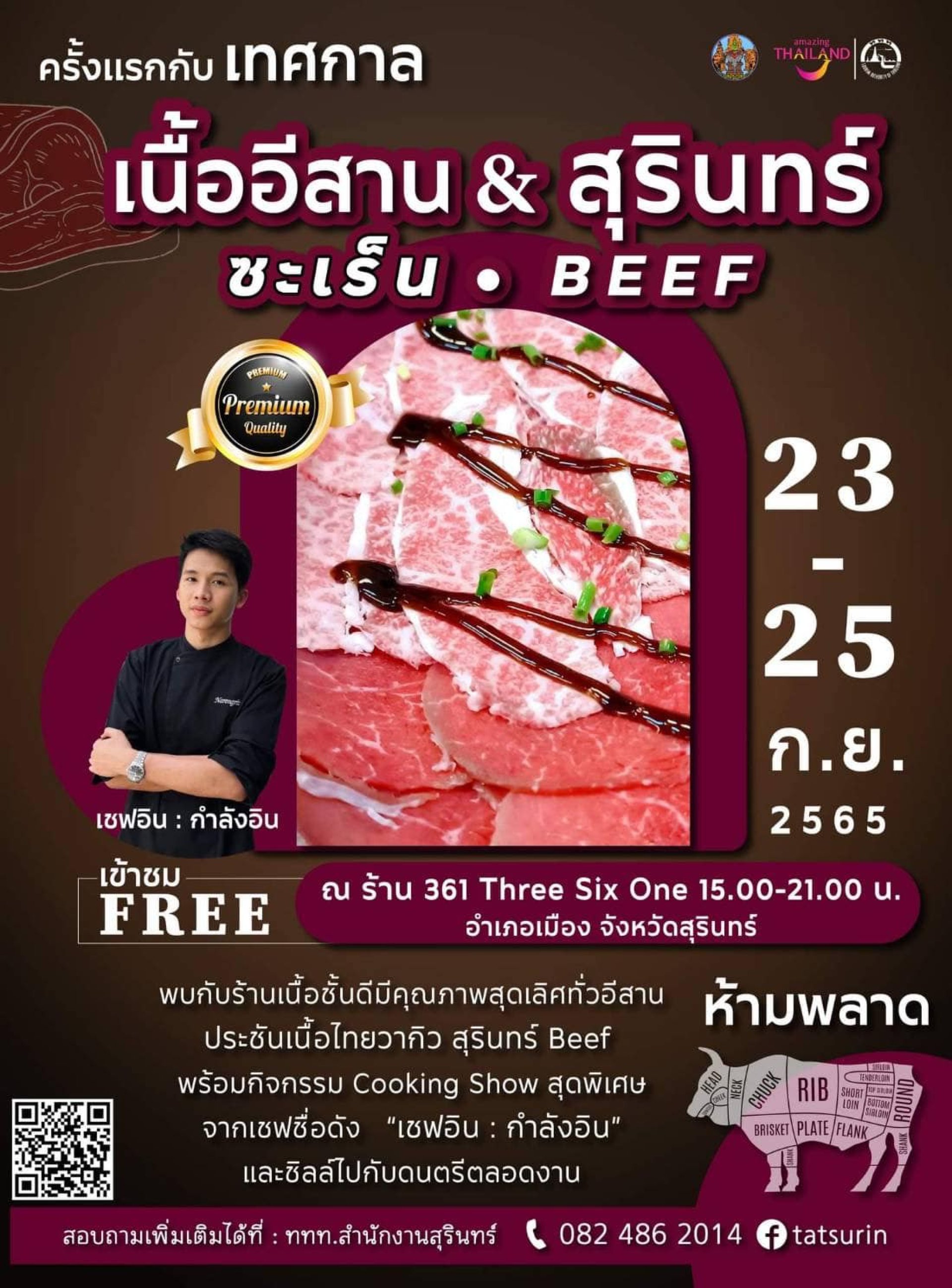 ยังไม่หมดนะ!!! ยังมีกิจกรรม Cooking Show สุดพิเศษ จากเชฟชื่อดัง "เชฟอิน : กำลังอิน" กับเมนูอาหารจากเนื้อไทยวากิวสุรินทร์ Beef พร้อมจัดเสิร์ฟแขกในงานพิธีเปิดด้วยน๊าา~
