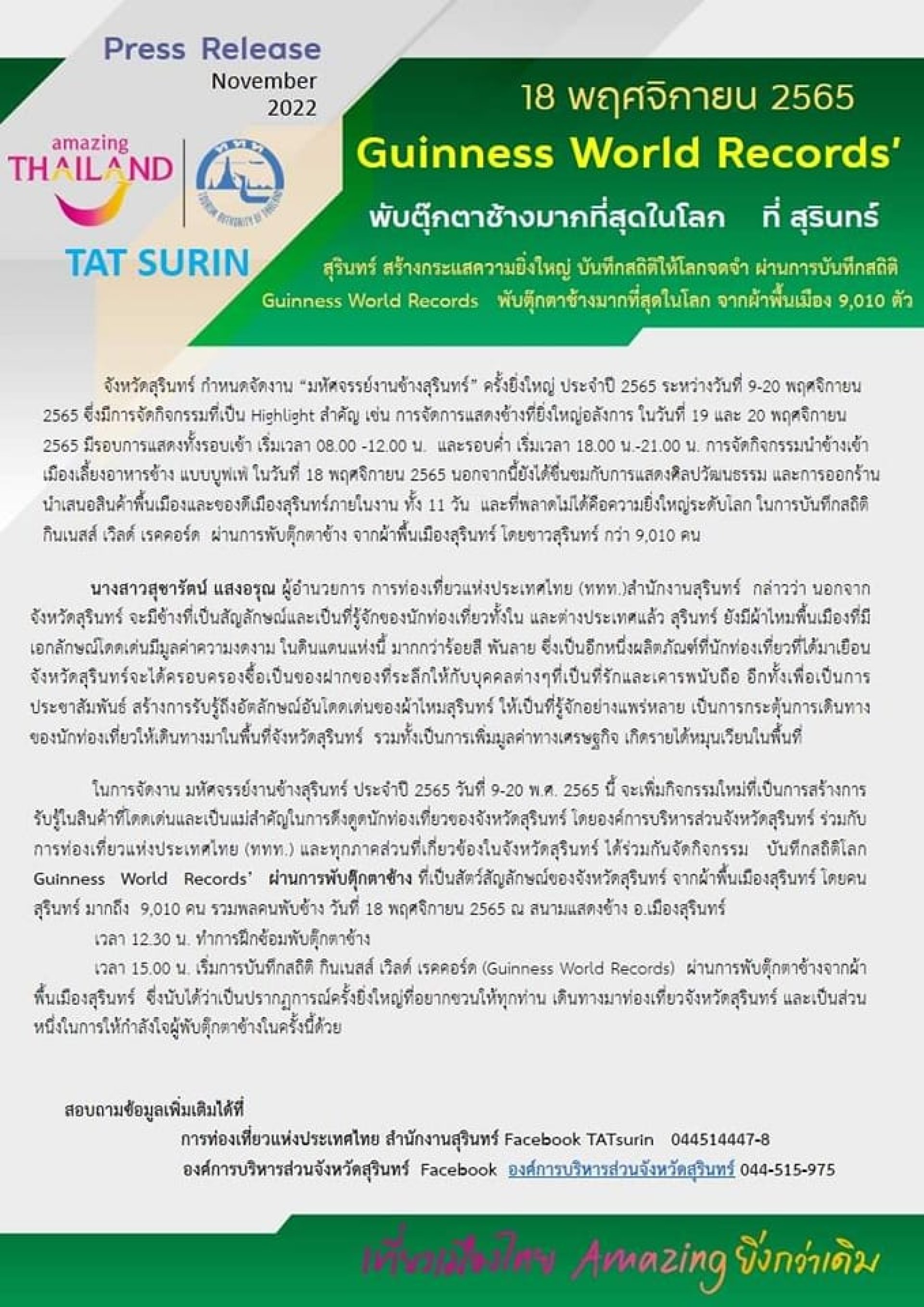 ที่พลาดไม่ได้คือความยิ่งใหญ่ระดับโลก ในการบันทึกสถิติ กินเนสส์ เวิลด์ เรคคอร์ด ผ่านการพับตุ๊กตาช้าง จากผ้าพื้นเมืองสุรินทร์ โดยชาวสุรินทร์ กว่า 9,010 คน