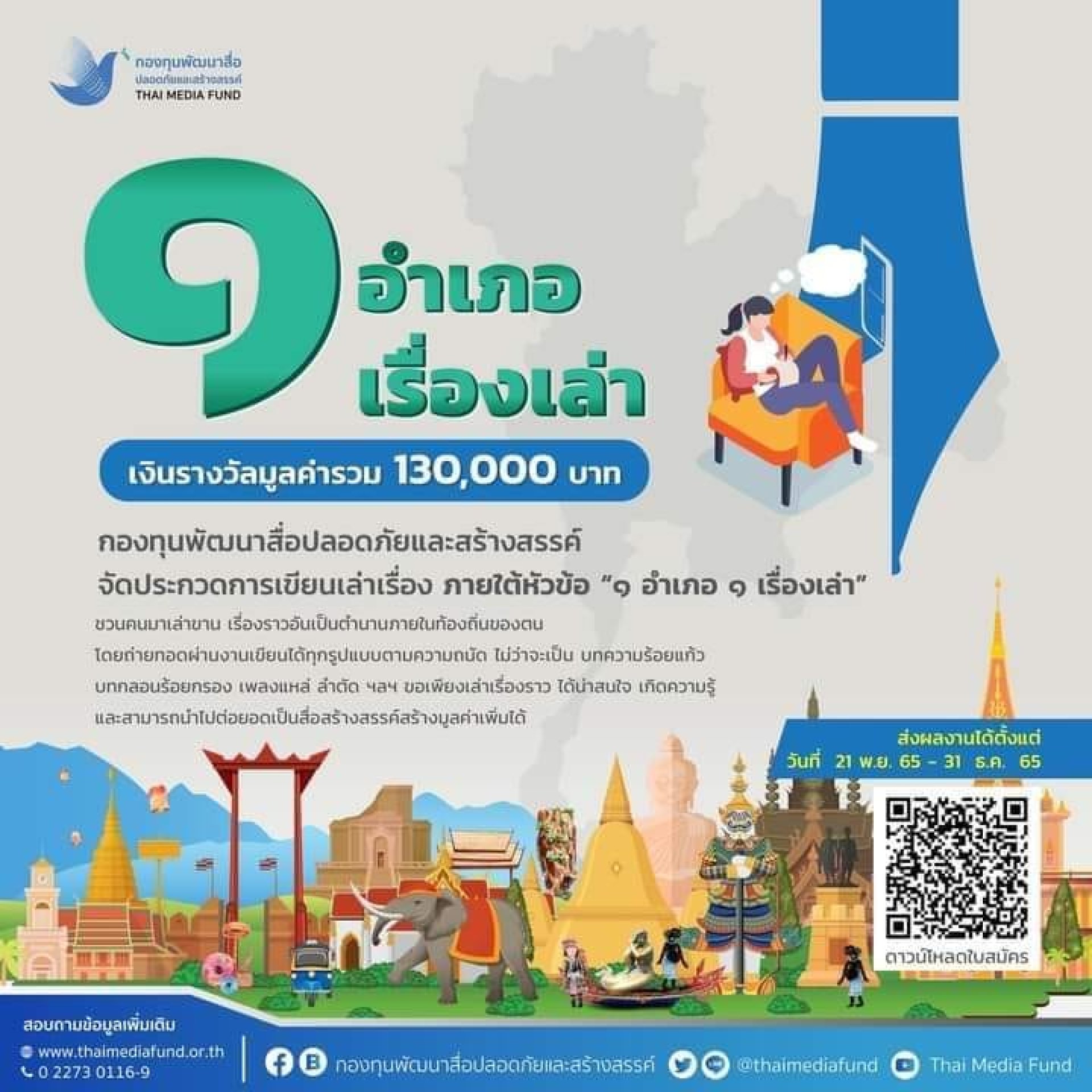 กองทุนพัฒนาสื่อปลอดภัยและสร้างสรรค์ ชวนคุณมาเล่าขาน ตำนานท้องถิ่น กับกิจกรรมประกวดเรื่องเล่า ภายใต้หัวข้อ 1 อำเภอ 1 เรื่องเล่า โดยถ่ายทอดผ่านงานเขียนได้ทุกรูปแบบ ทั้ง บทความ บทกลอน เพลงแหล่ หรือรูปแบบอื่นตามความถนัด ความยาว 3 5 หน้า กระดาษ A4 ลุ้นรางวัลรวม 130,000 บาท พร้อมโล่และเกียรติบัตร