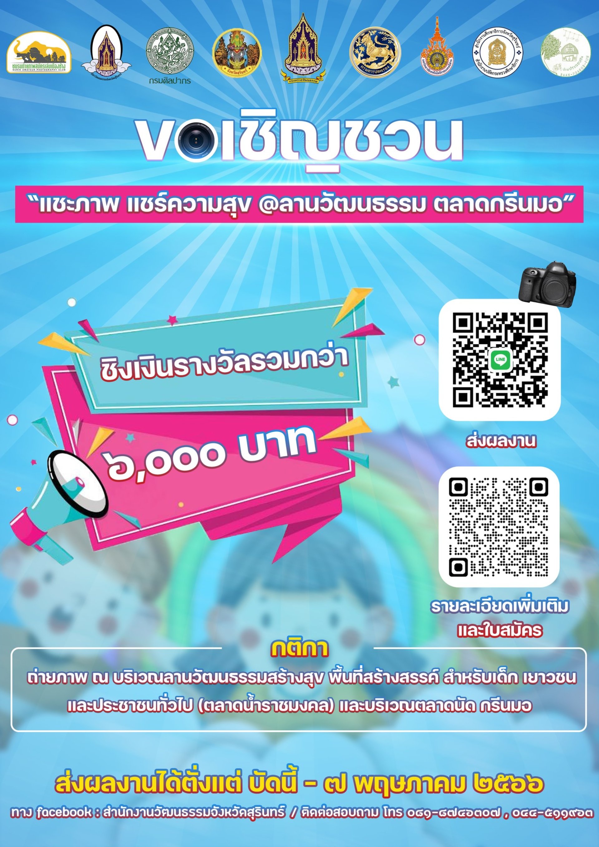 สำนักงานวัฒนธรรมจังหวัดสุรินทร์ เชิญชวนส่งภาพเข้าร่วมประกวด ในหัวข้อ แชะภาพ แชร์ความสุข @ ลานวัฒนธรรม ตลาดกรีนมอ ชิงเงินรางวัลกว่า 6,000 บาท ส่งผลงานได้ตั้งแต่วันนี้จนถึงวันที่ 7 ฑฤษภาคม 2566 สนใจแสกนข้อมูลเลย..