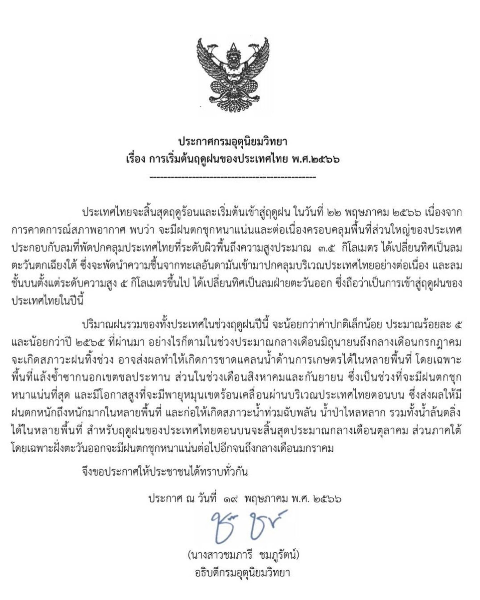 เตรียมตัวให้พร้อม โบกมือลา ฤดูร้อน22 พค.66เข้าฤดูฝน ประเทศไทยจะสิ้นสุดฤดูร้อนและเริ่มต้นเข้าสู่ฤดูฝนเนื่องจากการคาดการณ์สภาพอากาศพบว่าจะมีฝนตกชุกหนาแน่นและต่อเนื่องครอบคลุมพื้นที่ส่วนใหญ่ของไทยที่ระดับพื้นผิวถึงความสูง 3.5 กิโลเมตร ได้เปลี่ยนทิศเป็นลมตะวันตกเฉียงใต้ ซึ่งจะพัดนำความชื้นจากทะเลอันดามันเข้ามาปกคลุมประเทศไทยอย่างต่อเนื่อง และลมชั้นบนตั้งแต่ 5 กิโลเมตรขึ้นไป ได้เปลี่ยนทิศเป็นลมฝ่ายตะวันออก ซึ่งถือว่าเป็นการเข้าสู่ฤดูฝนของประเทศไทยในปีนี้