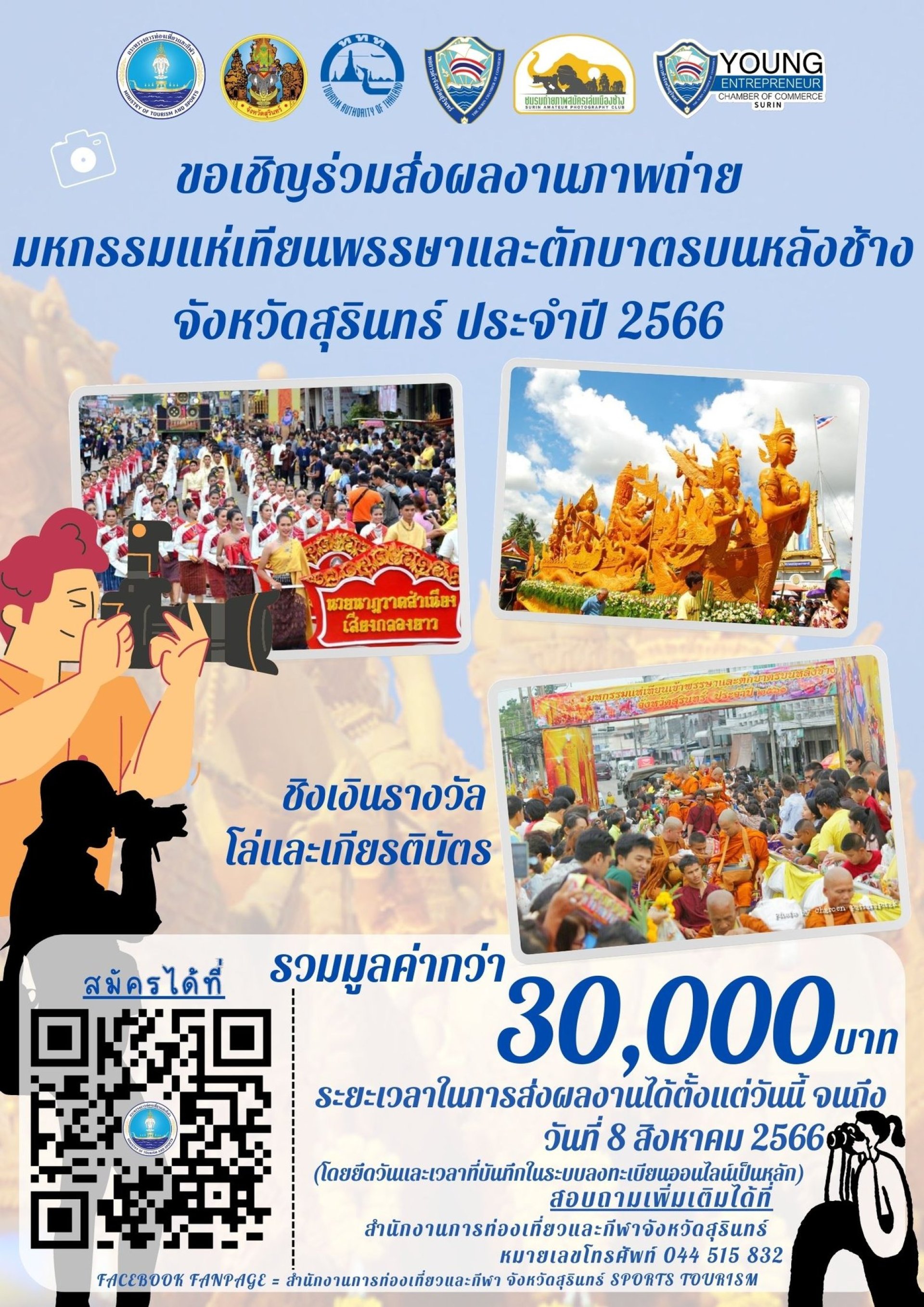 ขอเชิญร่วมส่งผลงานภาพถ่าย #มหกรรมแห่เทียนพรรษาและตักบาตรบนหลังช้าง จังหวัดสุรินทร์ ประจำปี 2566 ชิงเงินรางวัลและเกียรติบัตร รวมมูลค่ากว่า 30,000 บาท
