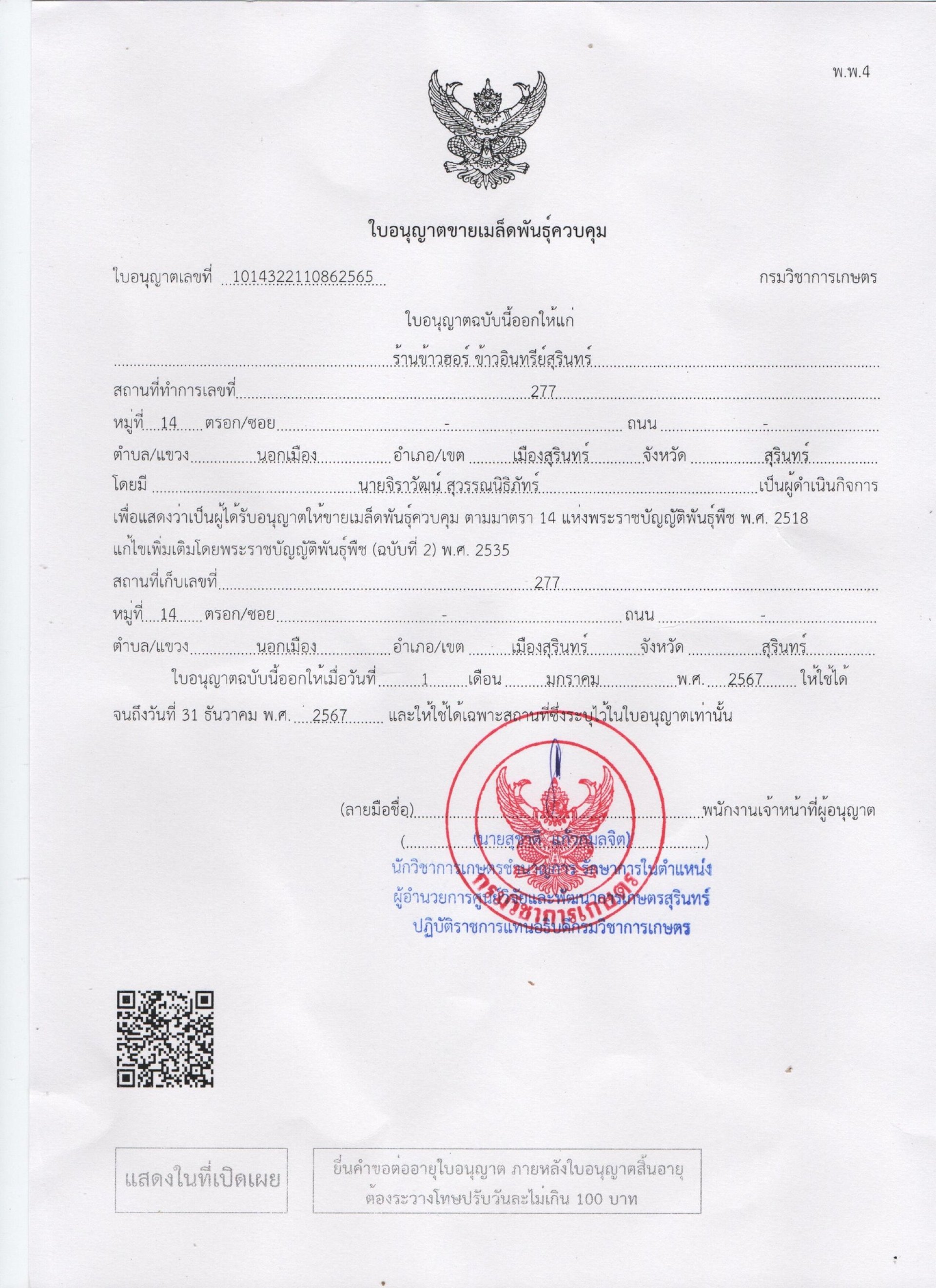 ใบอนุญาตขายเมล็ดพันธุ์ข้าว ประจำปี 2567