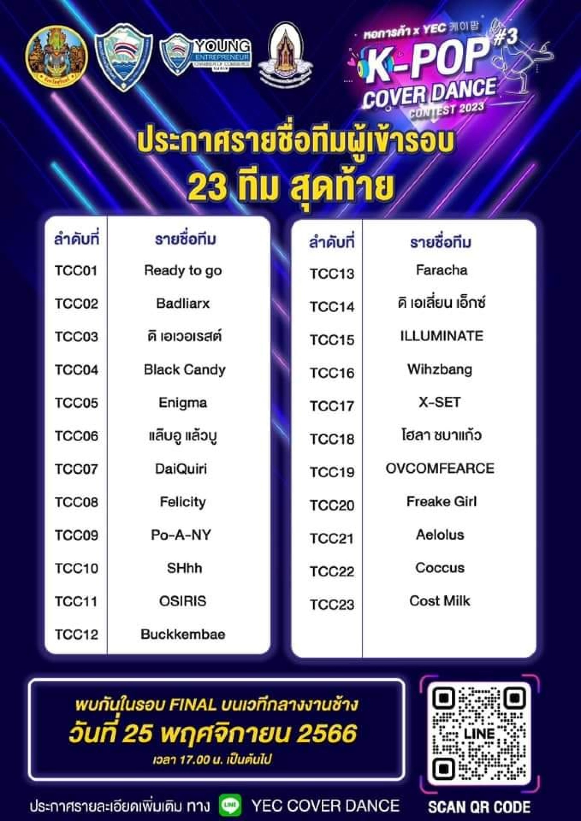ขอให้ทีมที่ผ่านเข้ารอบ ยืนยันสิทธิ์การเข้าแข่งขัน ที่ไลน์ YEC COVER DANCE ด้วยน้า