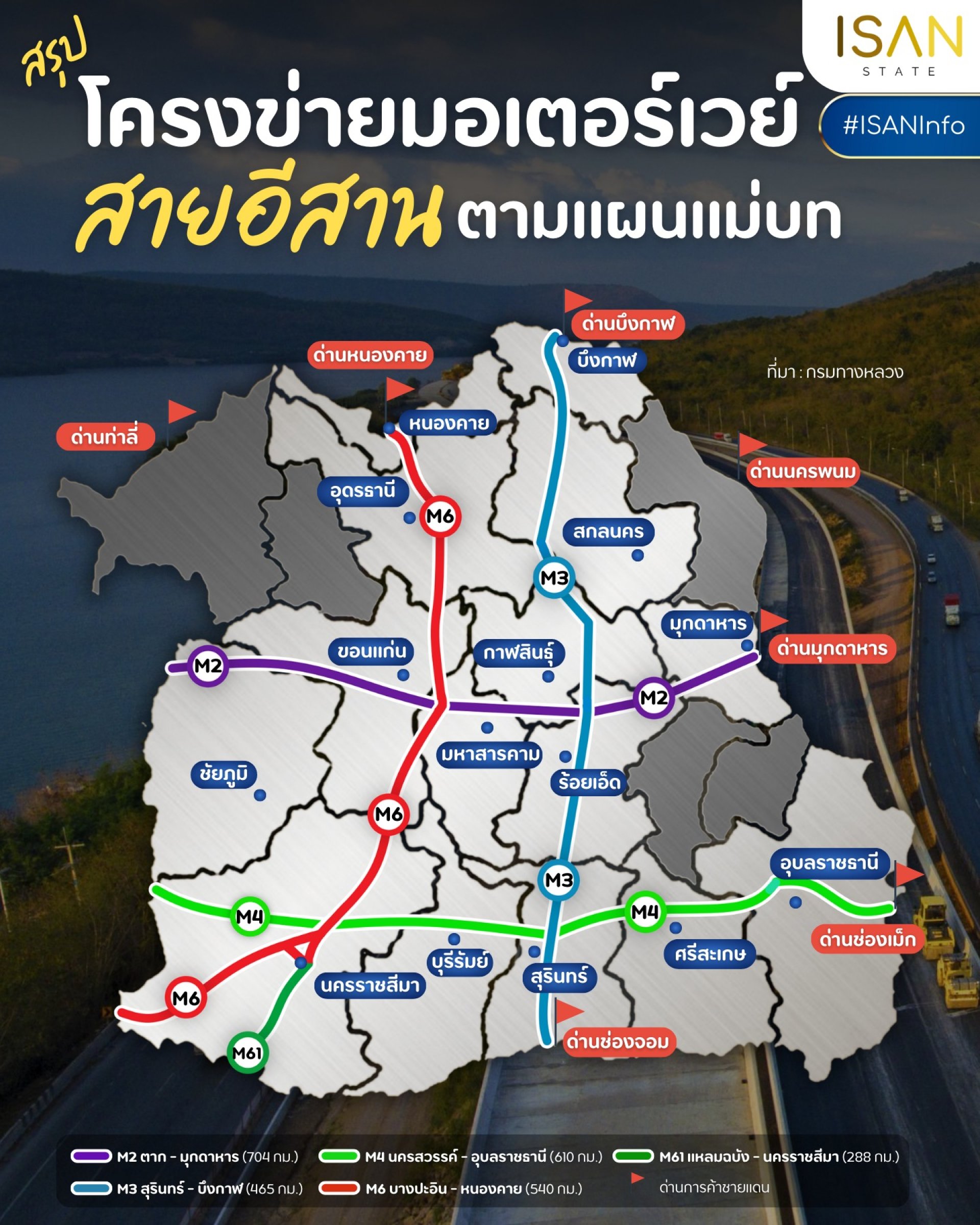 แล้วรู้หรือไม่ว่าในแผนแม่บทการพัฒนาทางหลวงพิเศษระหว่างเมืองหรือมอเตอร์เวย์ที่เชื่อมมายังภาคอีสานนั้นมีกี่สายและผ่านจังหวัดใดบ้าง