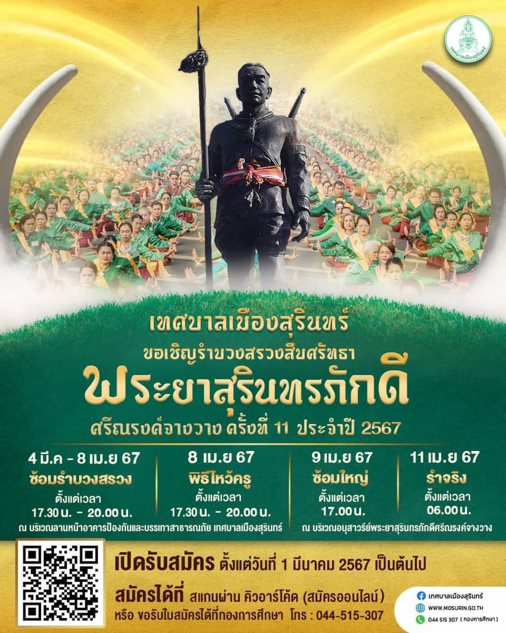 เทศบาลเมืองสุรินทร์ ขอเชิญร่วมรำบวงสรวงสืบศรัทธา พระยาสุรินทรภักดีศรีณรงค์จางวาง ครั้งที่ 11 ประจำปี 2567 เปิดรับสมัครออนไลน์ สแกนผ่านQR CODE เริ่มตั้งแต่วันที่ 1 มีนาคม 2567 เป็นต้นไป หรือ ขอรับใบสมัครได้ที่กองการศึกษา เทศบาลเมืองสุรินทร์ โทร 044515307