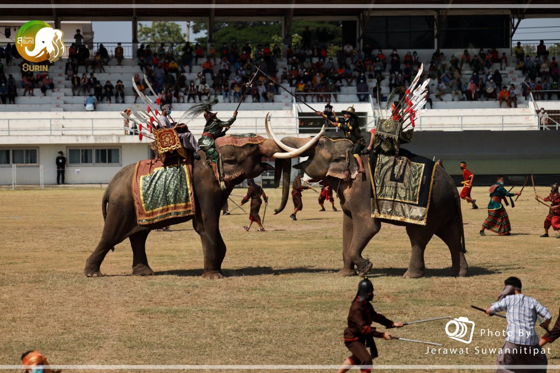 โดยในส่วนการแสดงของช้าง จะจัดในวันที่ 25 และ 26 ธันวาคม 2564 ที่สนามแสดงช้างจังหวัดสุรินทร์ ตำบลนอกเมือง อำเภอเมืองสุรินทร์ จังหวัดสุรินทร์ ซึ่งเป็นการแสดงความน่ารักและแสนรู้ของช้าง ที่ยังคงรักษาความโดดเด่นทางด้านขนบธรรมเนียม ประเพณี ศิลปวัฒนธรรม และความเป็นอัตลักษณ์ชาวเขมร กูยและลาว ซึ่งได้ผสมผสานการแสดงด้านศิลปวัฒนธรรมประเพณีลงในฉากการแสดงของช้าง เพื่อเล่าเรื่องราวความเป็นมาของชาวสุรินทร์ การแสดงถึงวิถีชีวิตความผูกพันระหว่างช้างกับชาวสุรินทร์ การจำลองพิธีกรรมเกี่ยวกับการเลี้ยงช้าง การแสดงการชนช้างที่สมจริงสมจังมากที่สุด ซึ่งมีการรวมตัวของช้างในสนามที่มากกว่า 140 เชือก