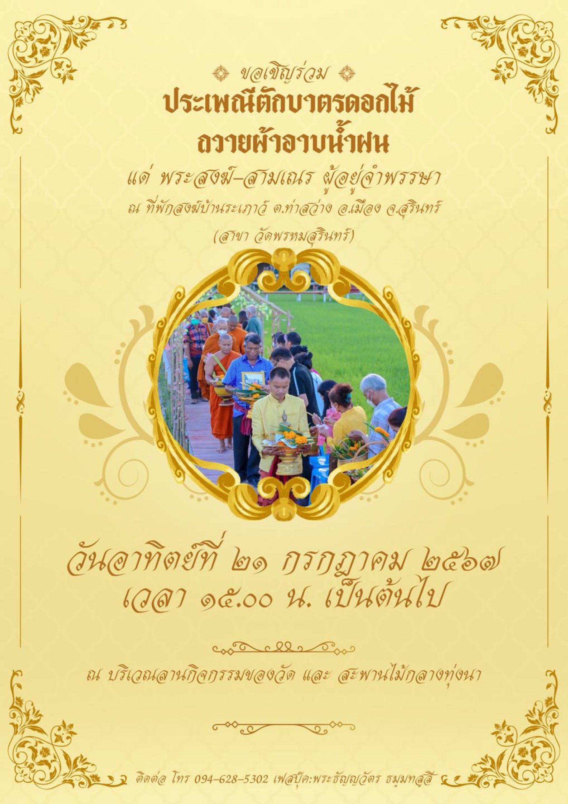 ขอเรียนเชิญร่วมบุญประเพณี #ตักบาตรดอกไม้ ถวายผ้าอาบน้ำฝน แด่พระภิกษุสงฆ์-สามเณร ผู้อยู่จำพรรษา ตามกำหนดการ