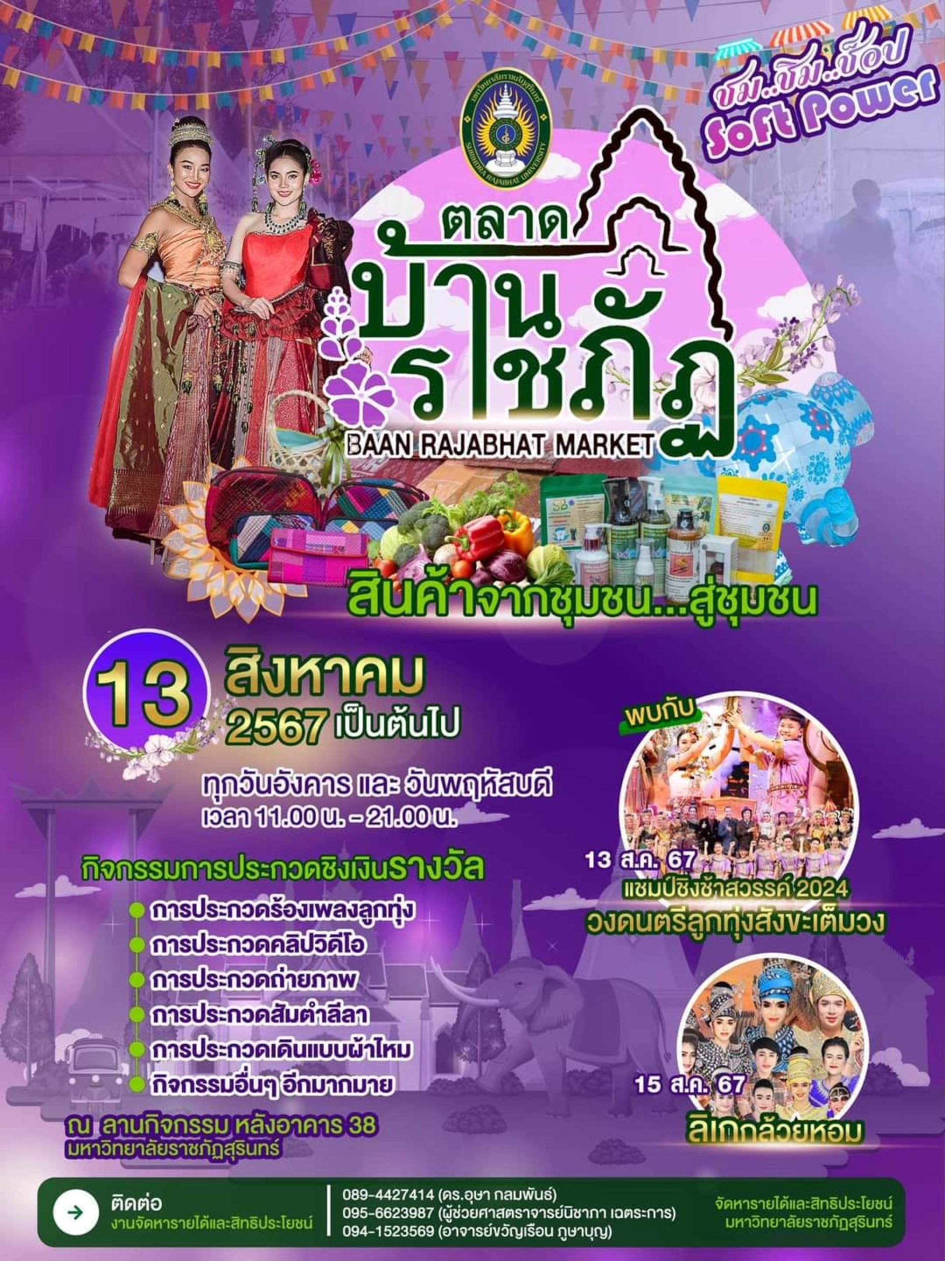 พบกันทุกวันอังคารและวันพฤหัสบดี ตั้งแต่วันที่ 13 สิงหาคม 2567 เป็นต้นไป ตลาดเปิดเวลา 11.00 - 21.00 น. ณ บริเวณด้านข้างคณะมนุษยศาสตร์และสังคมศาสตร์ (อาคาร 38) มหาวิทยาลัยราชภัฏสุรินทร์