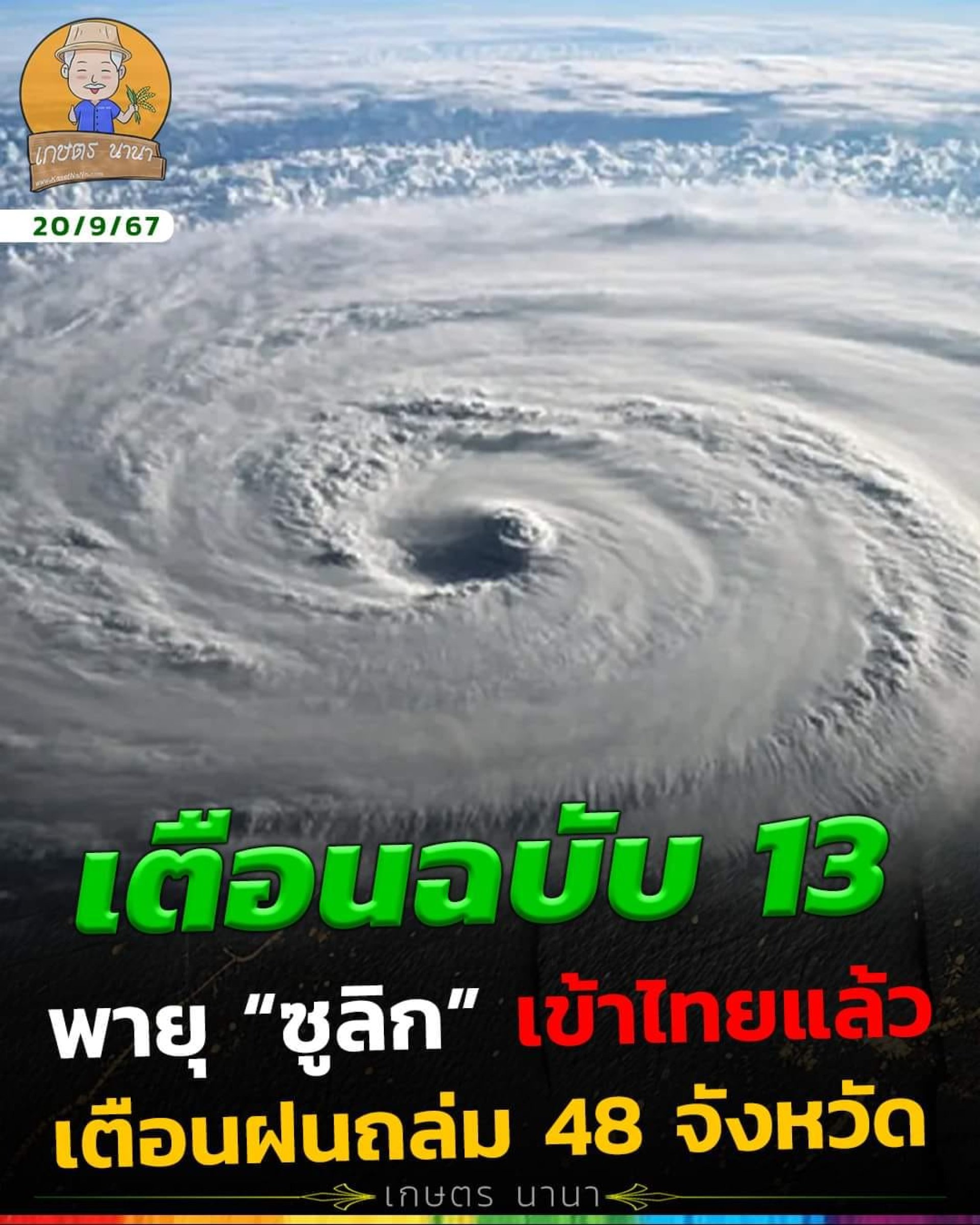พายุซูลิกเข้าไทยแล้ว ประกาศเตือนฉบับ 13 เตือนระวังฝนถล่ม 48 จังหวัด