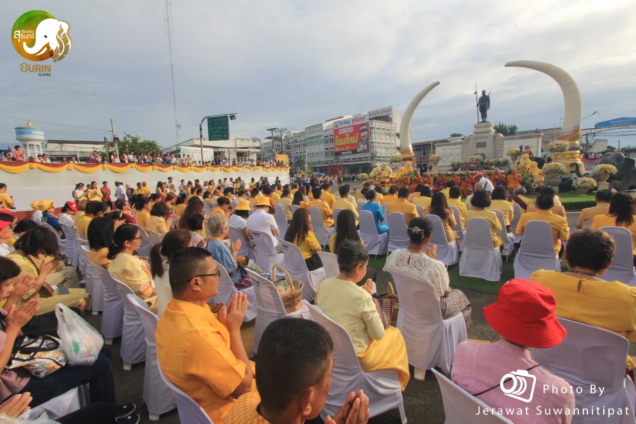 ประกอบกับชาวกูย และชาวสุรินทร์ นับถือพุทธศาสนาเป็นส่วนใหญ่ เพื่อสืบทอดวัฒนธรรมประเพณีอันดีงามที่ผสมผสานระหว่างพุทธศาสนาและความผูกผันของคนกับช้าง จึงเกิดประเพณี แห่เทียนพรรษาและตักบาตรบนหลังช้าง ขึ้น ซึ่งถือว่าเป็นประเพณีงานบุญแห่งแรกและแห่งเดียวในโลก ที่เราจะได้มีโอกาสได้ใส่บาตรบนหลังช้าง